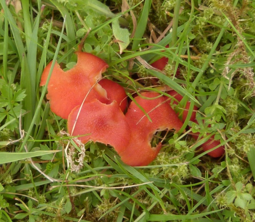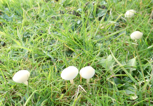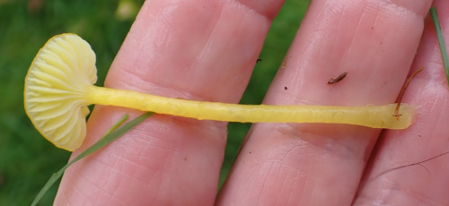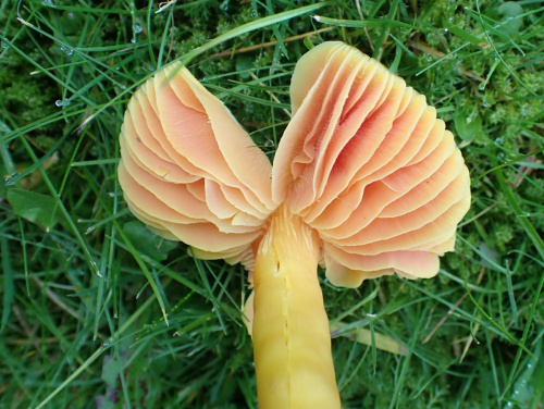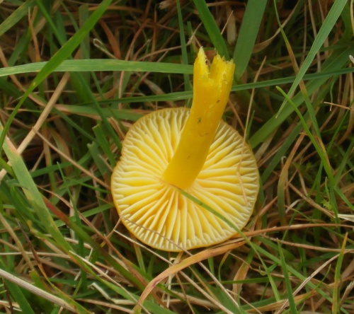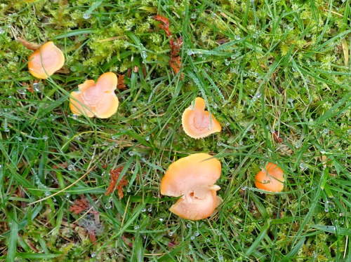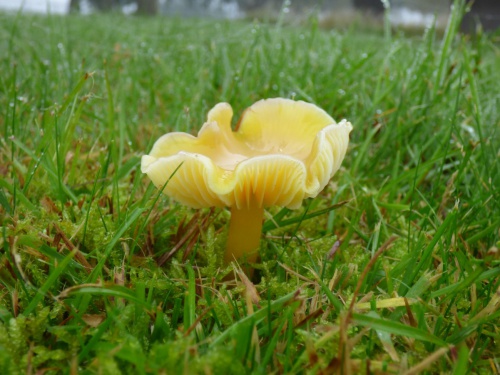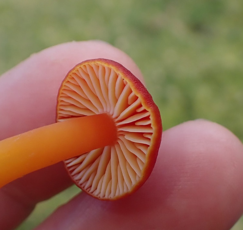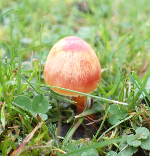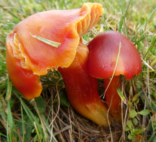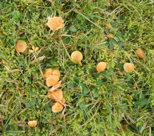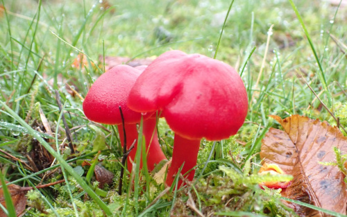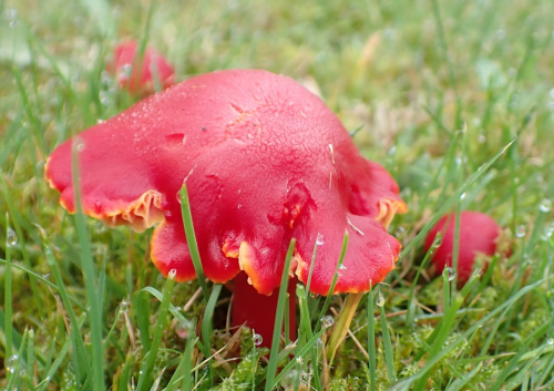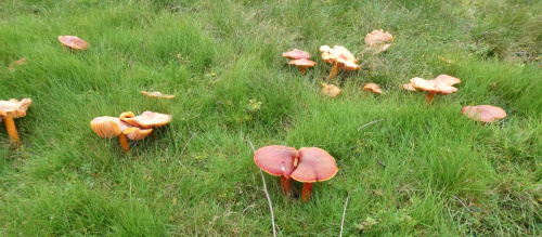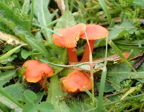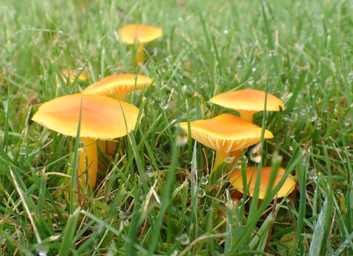 Waxcaps are grassland fungi, favouring mown or closely grazed old unimproved grasslands, and have often been used as indicators of conservation-value grasslands. The Waxcap texture - slimy, dry, greasy or sticky (viscid) - of the cap and stipe are more important characters than colour, size or shape, which are very variable. Microscopic examination of the spores may help to identify some, but i gerenal waxcap spores are al of similar size and shape, and are all white. Churchyards and cemeteries are good places to look. More information is here on the Leicestershire Fungi Study Group's website, and on these two helpful websites: