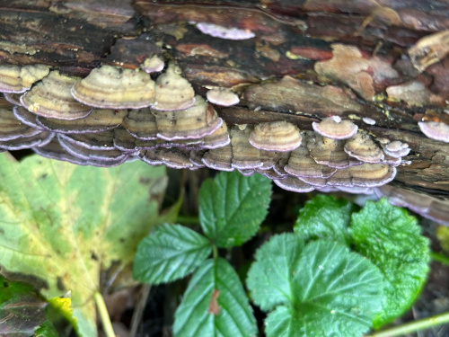 Brackets project from the trunk or branch or log, and often have a woody or leathery feel. Some are perennial, growing to a large size over many years - these shouldn't be collected. Spores form in tubes on the underside of the brackets, which end in pores that can be rounded, mazelike, elongated, angular, etc. The shape of the pores can help to identify them, so always photograph the underside. Crusts, Porecrusts and Resupinates form a layer over the wood substrate. Some species have growth forms with a resupinate part and bracketing part to the fungus.