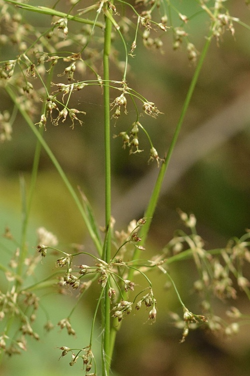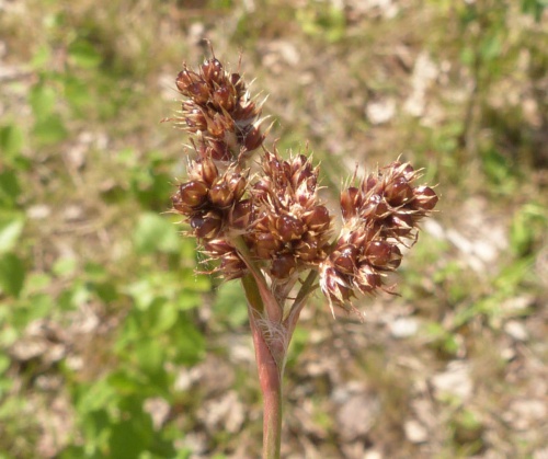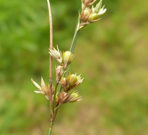 Rushes (Juncus) are usually aquatic or prefer marshy ground; they sometimes have rounded or flattened leaves, but several species lack stem-leaves. Stems are usually rounded and with central pith-filled cavity. Many species have short rhizomes and grow in dense tufts. Flowers are green- or brownish, with 6 tepals, 3 inner and 3 outer; usually 6 stamens; and a single seed capsule. 'Tepal' is the term used when petals and sepals are similar, instead of being differentiated (as is often the case with flowering plants with coloured petals and green sepals). Identification of most species involves details of the mature tepals and capsule, so it is helpful to take close-up photos of these parts.