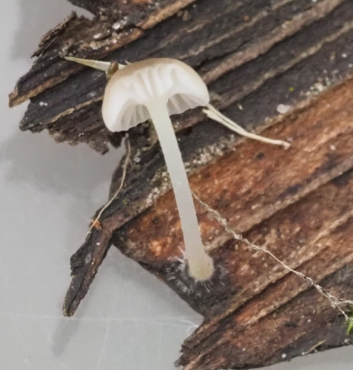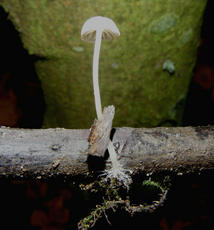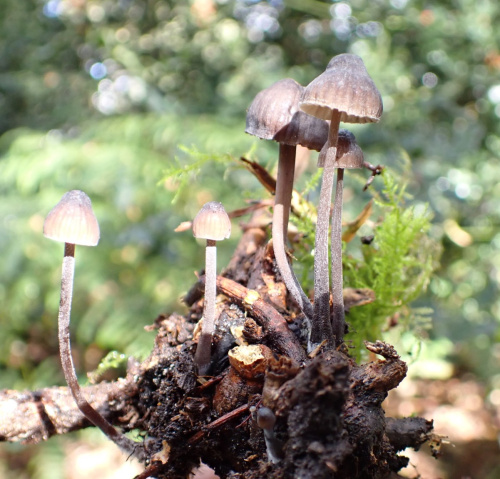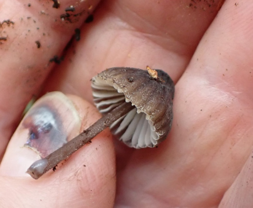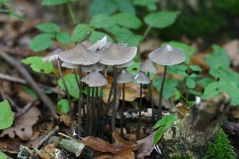 There are over 100 species of Mycena recorded from Britain, although many are not common. Identification is often difficult, and some species can't be identified on field characters alone; microscopic examination of the spores or cells (cheilocystidia) at the gill margins may be needed. Always note the substrate and habitat. Check specimens when fresh for smell, for white or coloured juice in the stem, and coloured margins to gill edges. In the gallery below, an exclamation mark after the Red or Amber camera icon means that microscopy is needed, or another feature such as substrate, taste, smell or staining should be recorded.