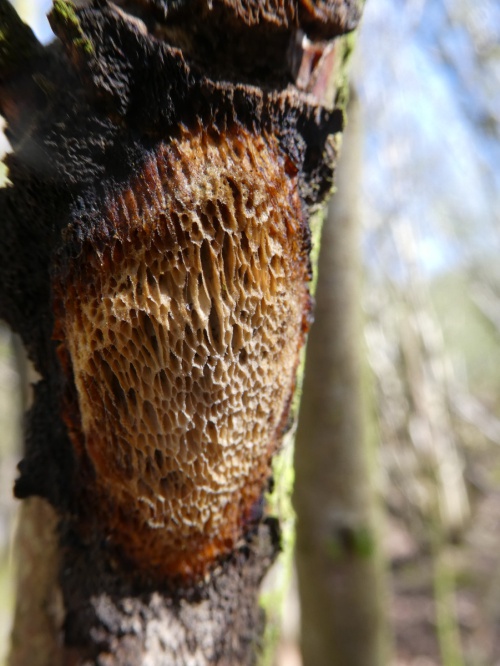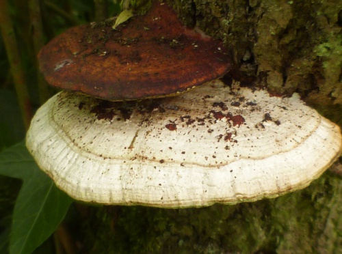 Brackets project from the trunk or branch or log, and often have a woody or leathery feel. Some are perennial, growing to a large size over many years - these shouldn't be collected. Spores form in tubes on the underside of the brackets, which end in pores that can be rounded, mazelike, elongated, angular, etc. The shape of the pores can help to identify them, so always photograph the underside. Crusts, Porecrusts and Resupinates form a layer over the wood substrate. Some species have growth forms with a resupinate part and bracketing part to the fungus.