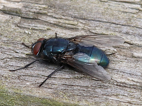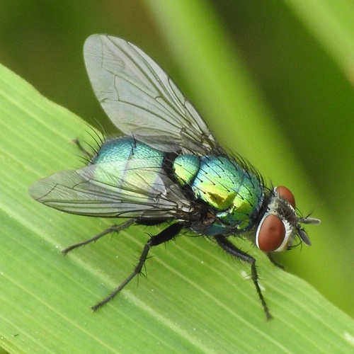 Adults are commonly shiny with metallic coloring, often with blue, green, or black. Many species lay eggs on meat or carrion and they get their old English name from meat being 'blown' with maggots.
