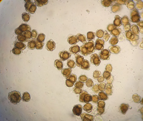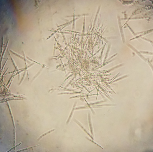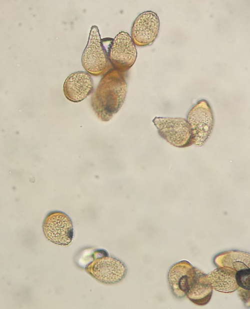 Urocystidae have characteristic spore balls formed of one or more spores surrounded by several sterile hyaline cells, giving a bubbly apperance under the microscope. They are in Class Ustilaginomyctes - Order Urocystidales