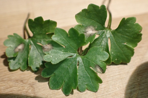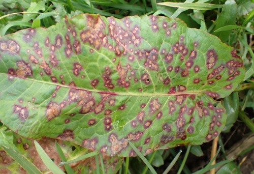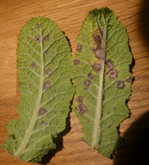 It includes the White Moulds (Ramularia spp.) - a large group of parasitic fungi, some of which cause significant diseases of crops and garden plants. Affected leaves have spots on the upper surface. These are 'anamorph' species and reproduction is asexual via 'conidia'. The fungal hyphae are embedded in the host tissue. The conidia are borne on 'conidiophores' grouped into dense white or greyish tufts called 'caespituli', which usuallay emerge on the underside of the leaf from stomata - you should check for these using hand lens or low power microscope. This is very different to the web of mycelia caused by Erysiphaceae - the powdery mildews. A few hosts have several White Moulds, and in these cases microscopic examination of conidia is needed. According to Chater et al, 2021 (ref. below), the sexual 'teleomorph' stages are known as Mycosphaerella species; they reproduce by ascospores formed in asci . The counterpart Mycosphaerella to a Ramularia species has only been conclusively proven in a few cases.