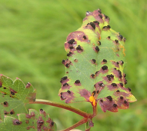 - Teliospores borne on telia - in late summer, dark brown or black pustules are produced on the primary host bearing the over-wintering teliospores (see example).