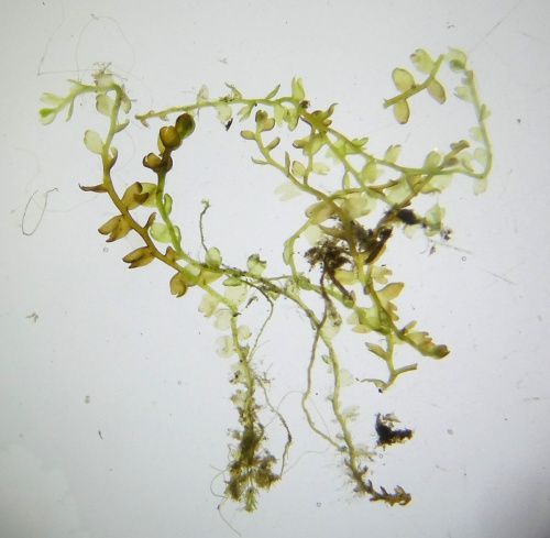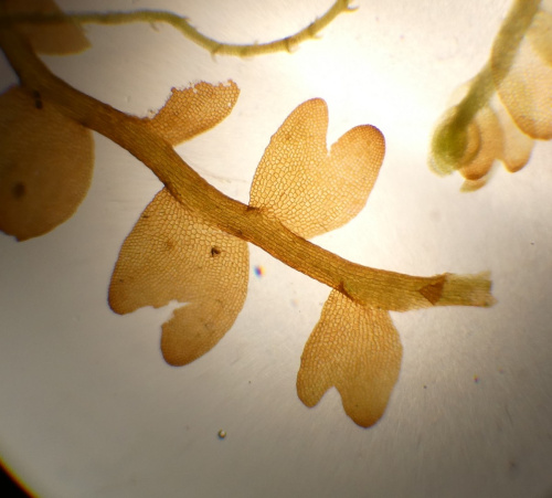 Leafy liverworts may have leaves in two ranks, with no underleaves, or in two ranks with a third row of leaves undeneath. Sometimes the underleaves are very small and hard to find by eye; a good hand lens or low powered microscope will be needed. The leaves are often divided into two lobes with the smaller lobe bent over so that it is lying on or under the larger lobe; this can look as though there are 4 ranks of leaves. Often the lobes are cleft into two or more sections, or may be toothed or fringed.