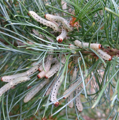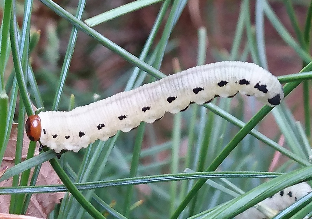 The larvae of the sawfly Diprion pini are a very pale lemon (almost off white) with rows of dark spots – they may infest various species of pine.
