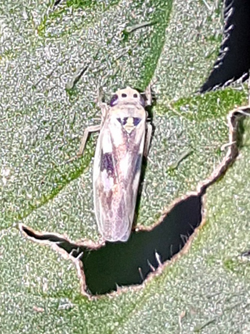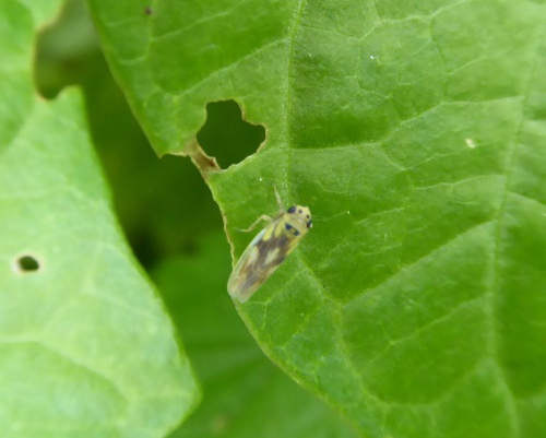 Length 4 to 4.5 mm. Macrosteles is an extremely difficult and diverse genus. The vertex has several dark spots or bars and the frons has dark markings; both features are variable. The forewings are greyish or green-yellow, often with brown longitudinal streaks, patches or stripes, but colour and amount of the darker markings varies. Dissection of the male to examine the internal genitalia - the aedeagus - or the internal abdominal structure - sternal apodemes - is needed to identify.