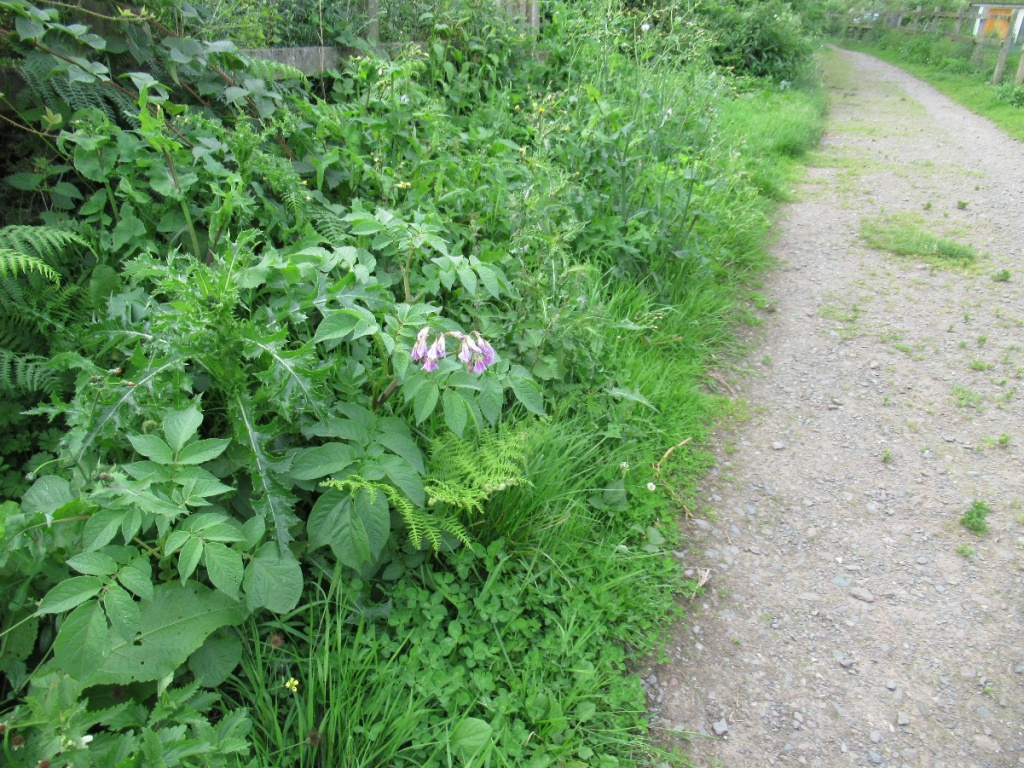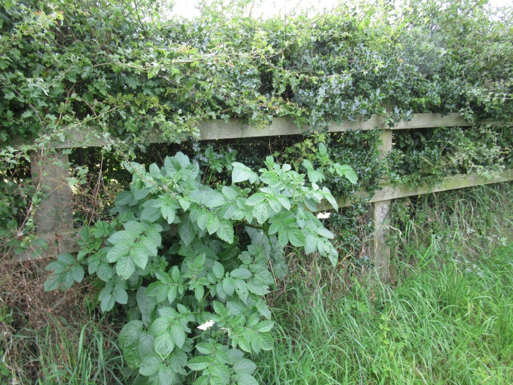 Familiar to us all as a cultivated food crop. The leaves are pinnately divided, very lightly hairy and are usually dark green. The flowers are various shades of white, pink or purple, have 5 petals with the stamens in a bright yellow cone in the middle of the flower. The tubers we eat are the swollen underground stems of the plant.