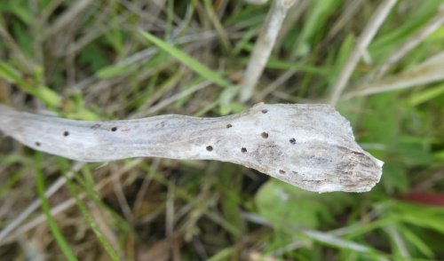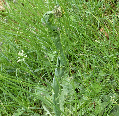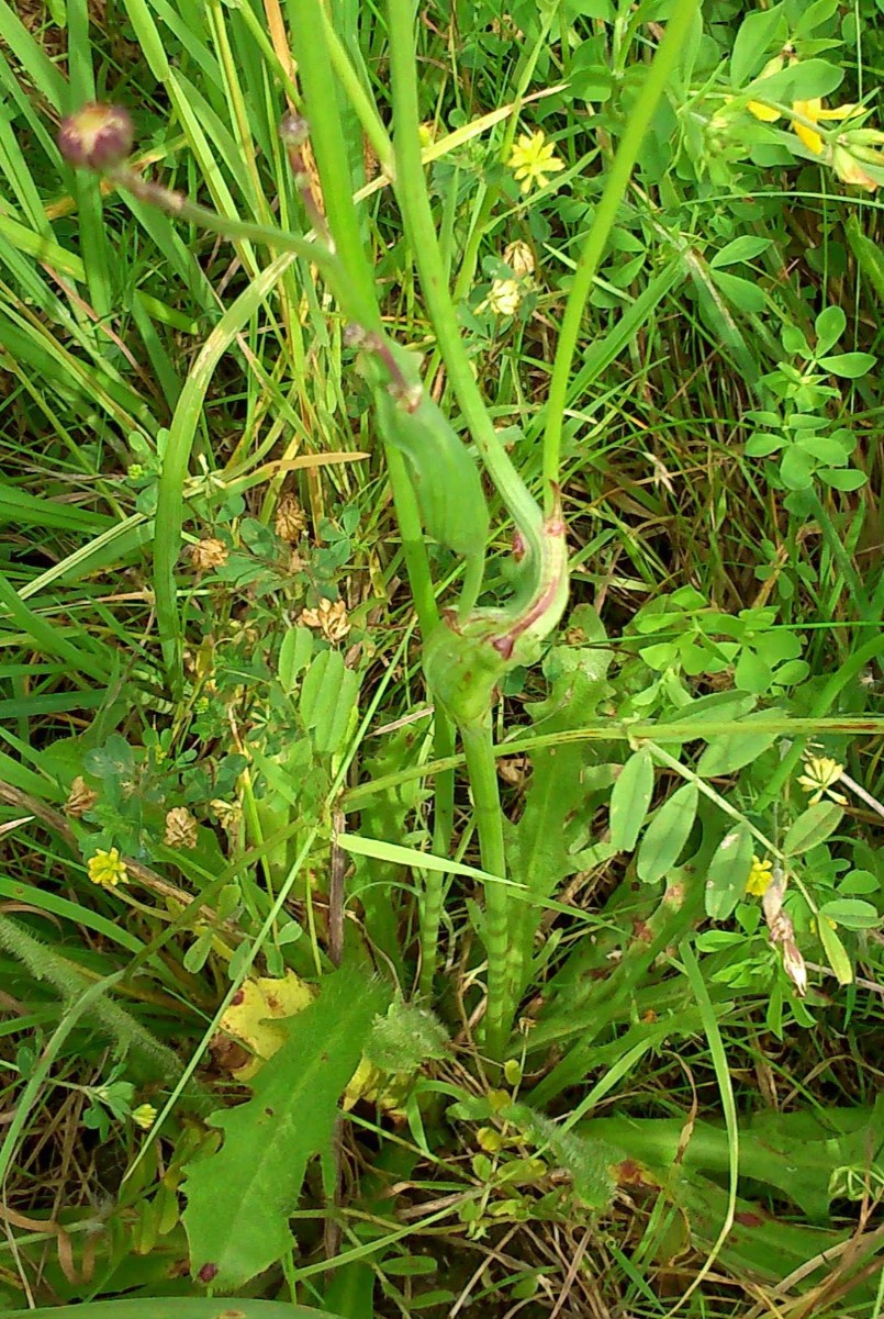 The cynipid wasp Phanacis hypochoeridis causes galls to form in Cat's-ear (Hypochaeris radicata). This takes the form of an elongated swelling, usually in the main stem of the plant, but sometimes in the flower stalk or petiole, succulent at first, later hard often wrinkled inside – up to 50 chambers, each with a yellowish-white larva.
