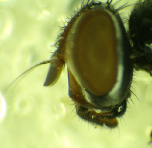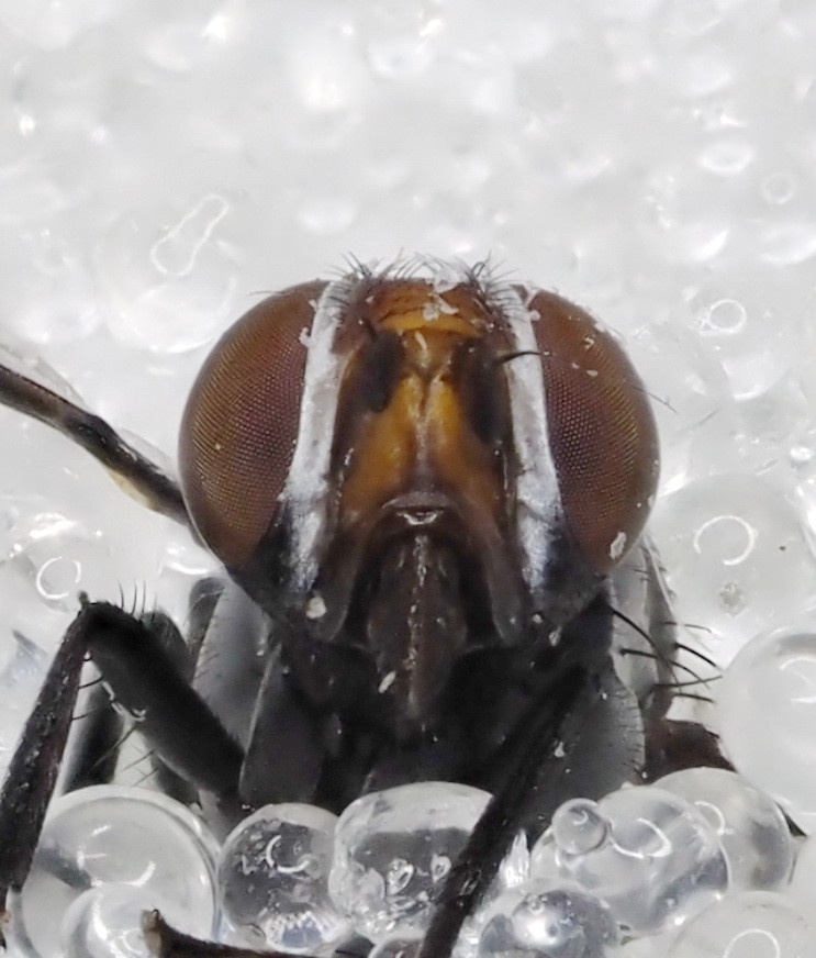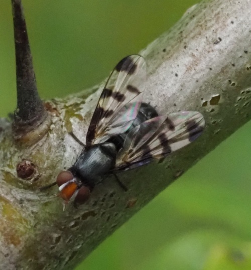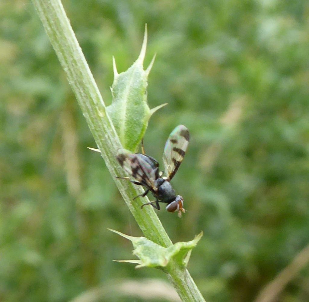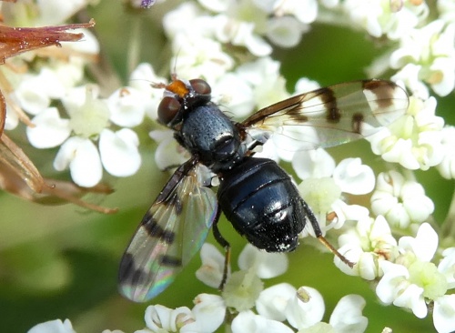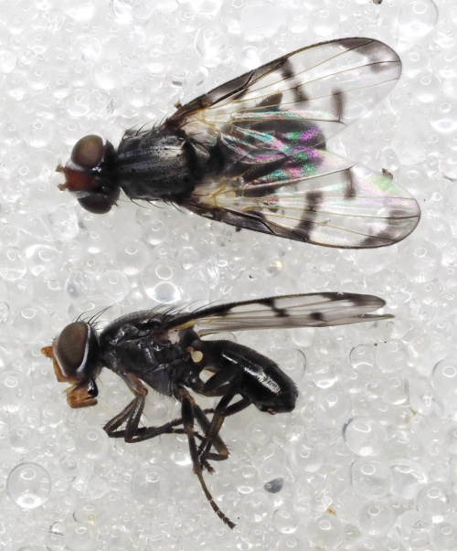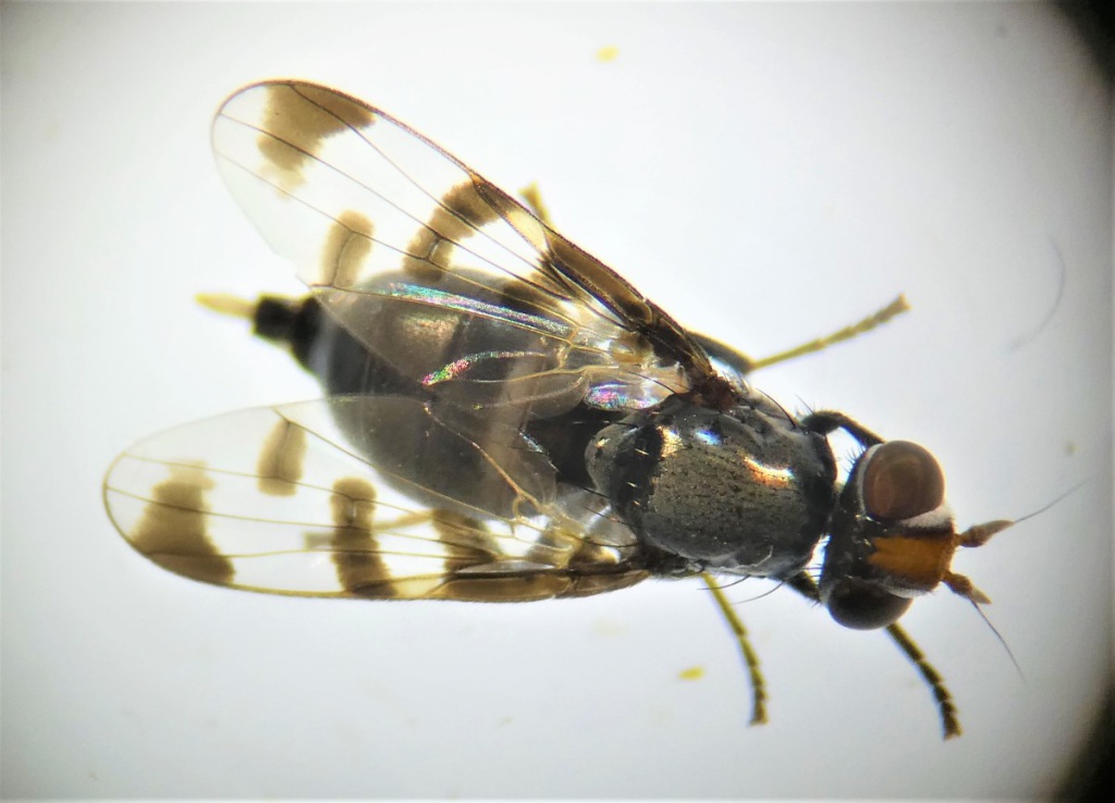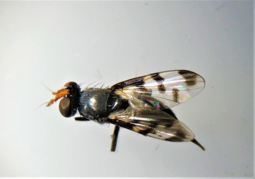 Wing length 3.5 to 4.5mm. This picture-winged fly has four dark areas on each wing with the basal and discal areas separated. Abdominal tergite 3 has a grey stripe at the base which is larger in the middle. The lower face is reddish-yellow. Third antennal segment pointed at the tip.