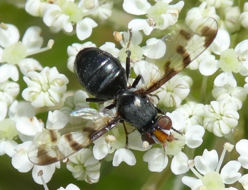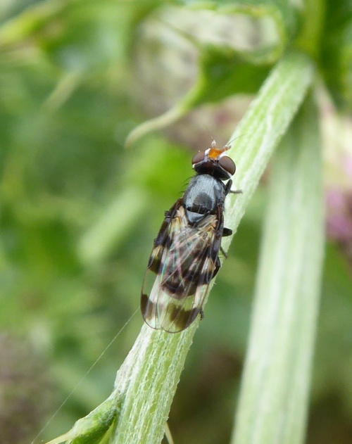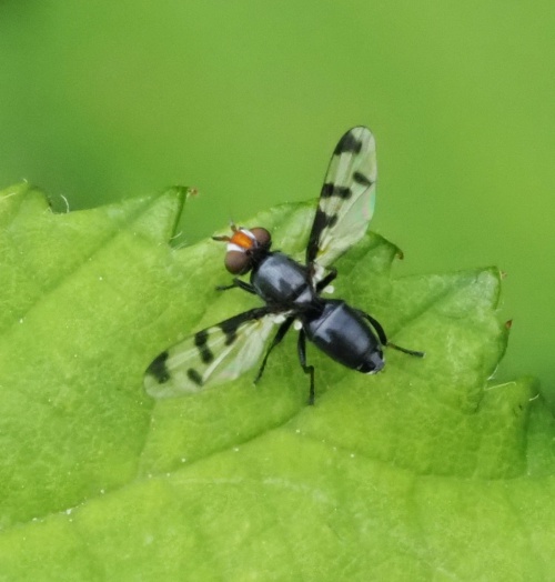 Herina nigrina is very similar but has a slightly smaller and less extensive wing clouds. In particular, the cloud over the r-m cross vein doesn't extend unbroken to the costa.