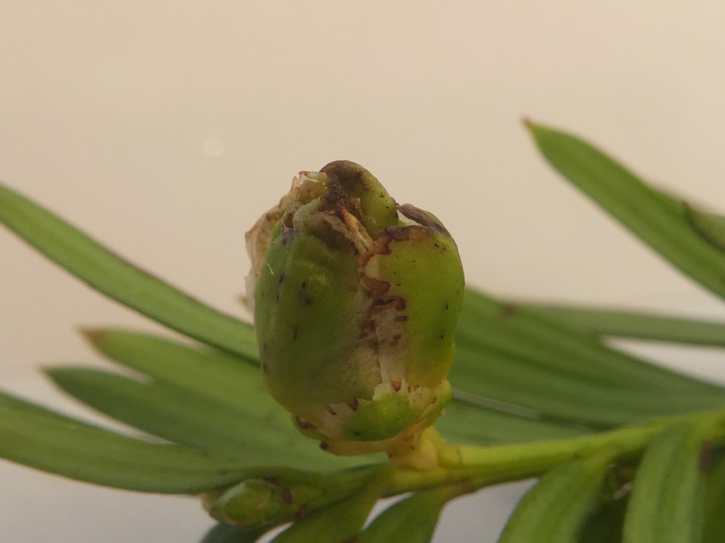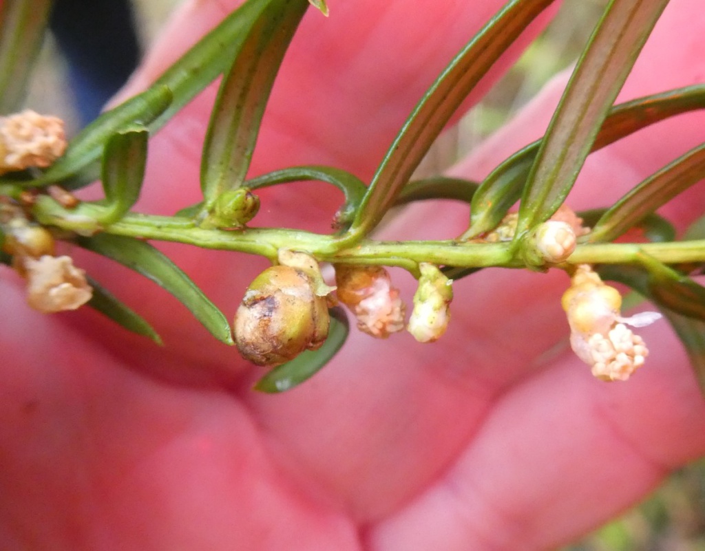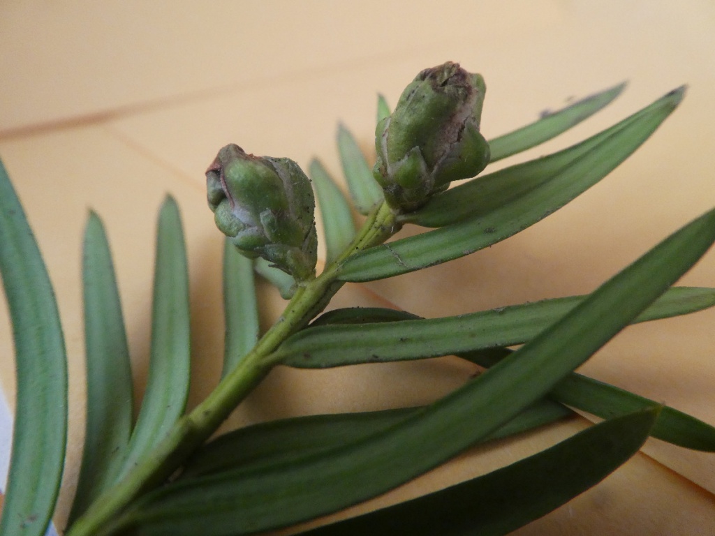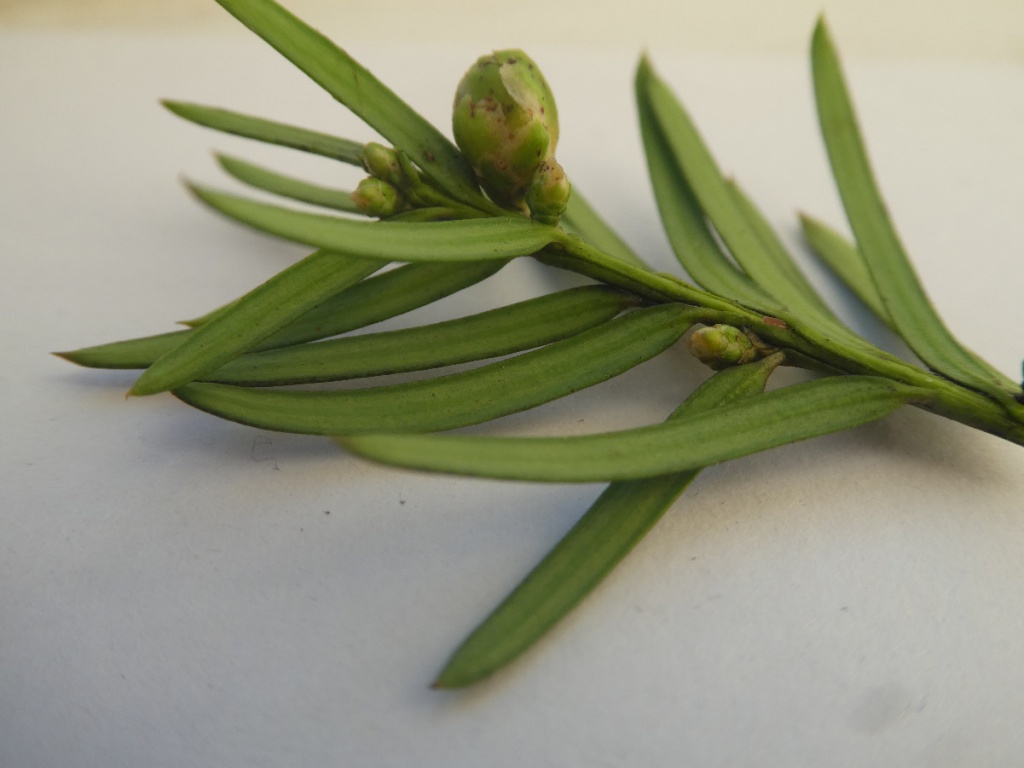 Taxomyia taxi (a gall-midge) causes galls large 'artichoke' galls in the terminal bud of Yew
