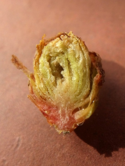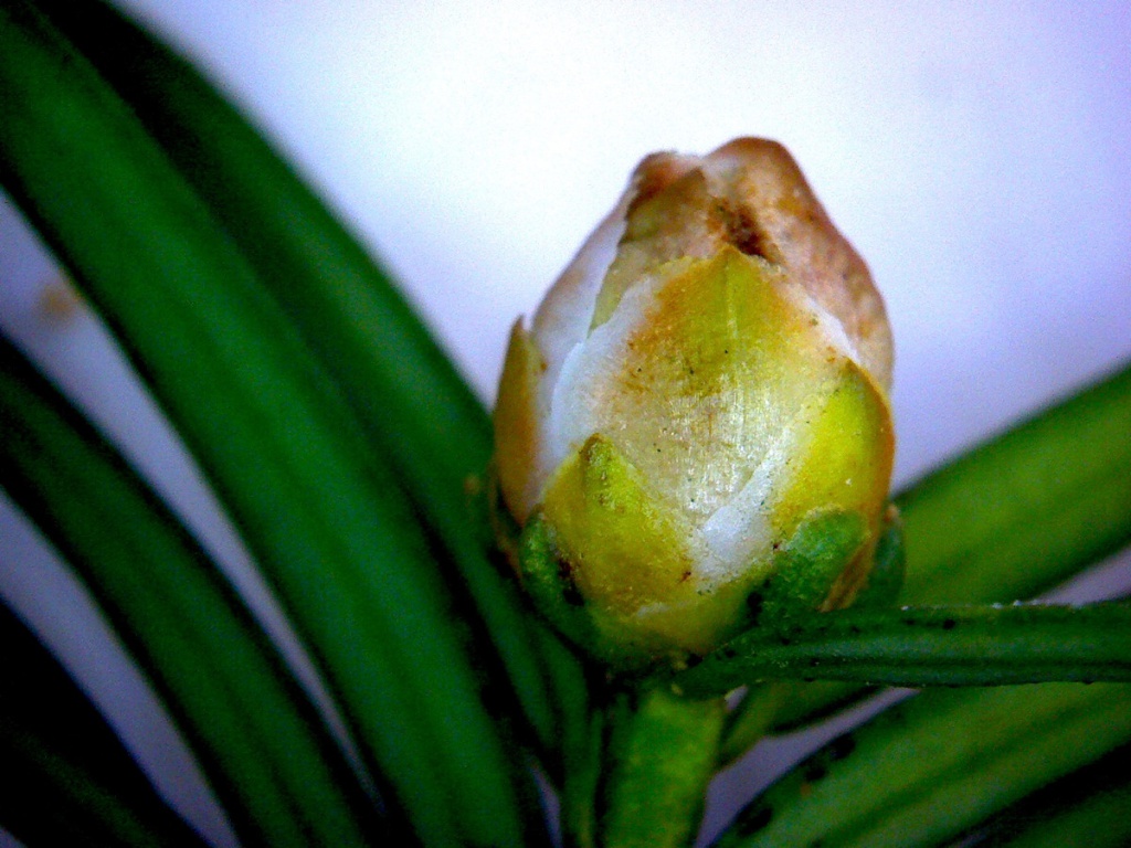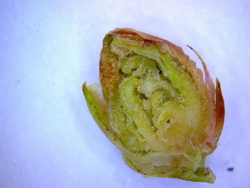 The mite Cecidophyopsis psilaspis causes galls to form on the buds of Yew, Taxus baccata. Mites live within the swollen and distorted leaves inside the bud.