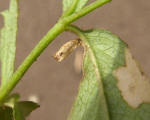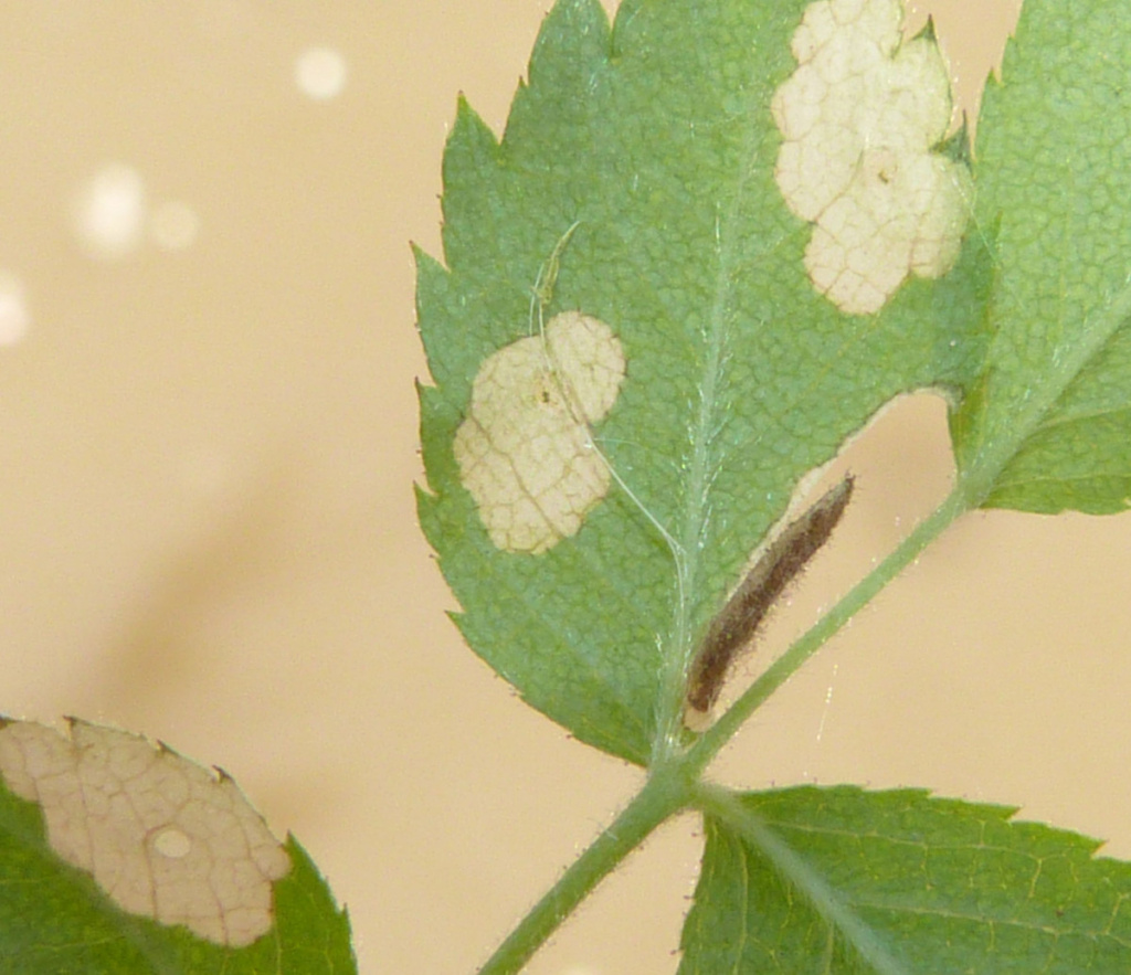 Cases and small circular transparent mines are commonly found on dog-rose. The mines have a small hole in the middle where the case was attached and through which the larva feeds.