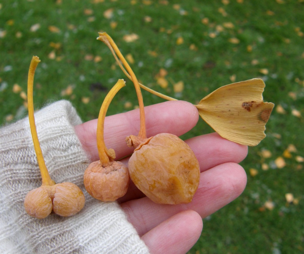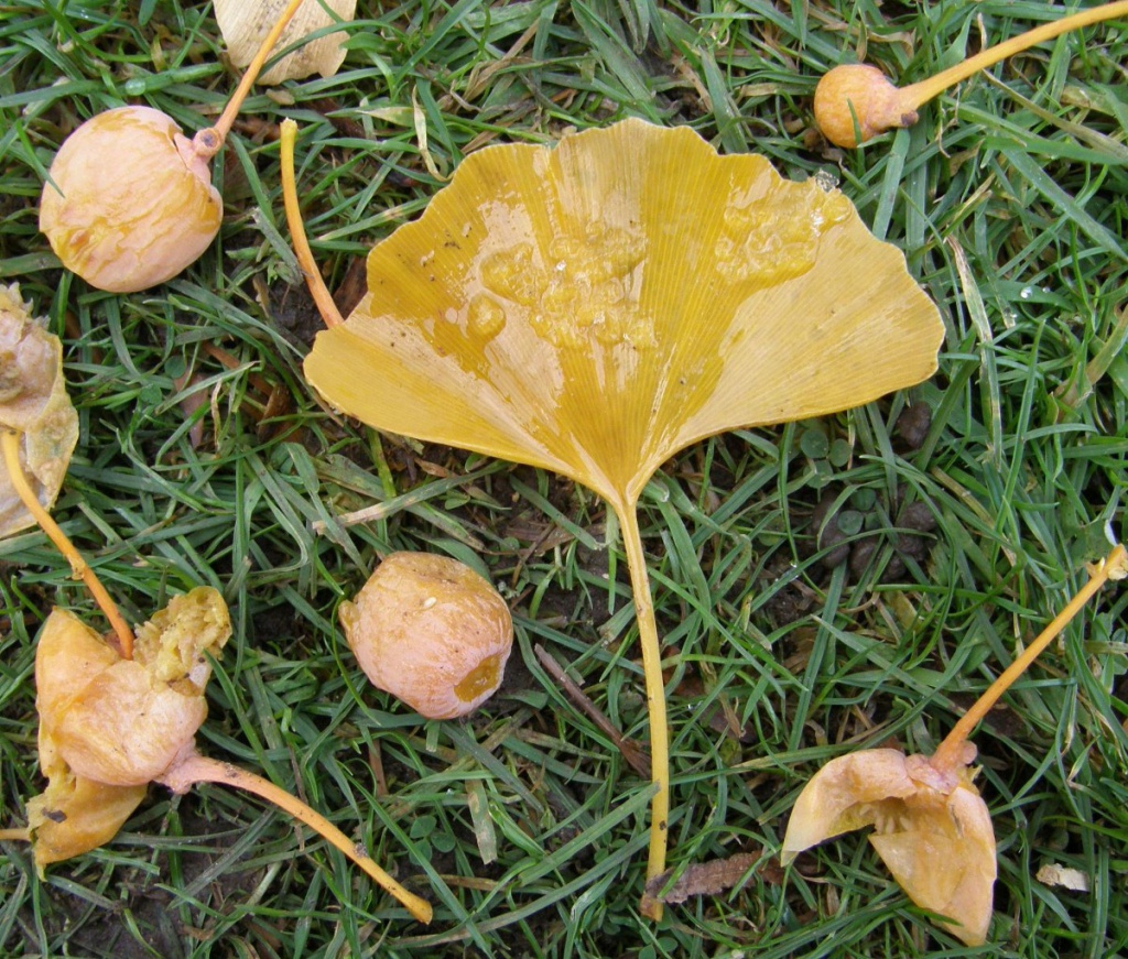 Tree to 40m tall. Bark grey, furrowed, corky. Leaves characteristically fan-shaped, up to 12cm across, divided into two lobes, bright yellow in autumn, spirally arranged along long shoots. Each tree has either male or female flowers (dioecious): male flowers catkin-like, hanging down (pendulous) and yellow, up to 8cm long; female flowers smaller and on pedicels up to 4cm long. Fruits maturing following autumn, drupe-like, light yellow decaying to purplish-black.