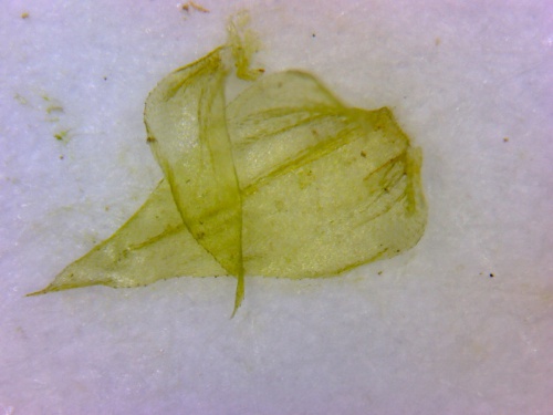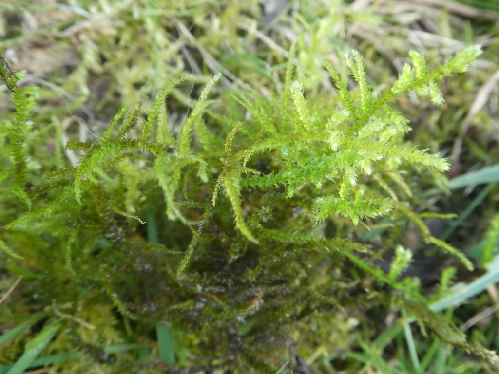 Common Striated Feather-moss forms cushions or mats that may extend over large areas. Shoots are generally pale or yellow-green, and more or less pinnately branched with branches spreading almost at right angles. The stems and branches are straight, making shoots look rigid. The leaves spread widely and hardly alter on drying, reaching 1.5 to 2 mm long. They are triangular (almost perfectly so above the base, with straight sides), but narrowed and heart-shaped at the point of attachment, and acute, but not attenuated at the tip. The margins are very finely toothed. A very important character, easily observed with a hand lens, is the wrinkled leaves, caused by shallow folds along their length. Capsules (2 to 3 mm long) are occasionally present, and have a beaked lid. There are similar species and detailed examination is needed.