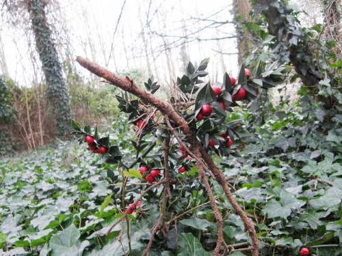 It flowers early in the year, followed by glossy red berries on female plants.