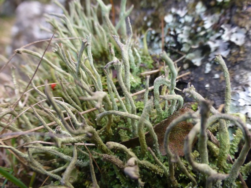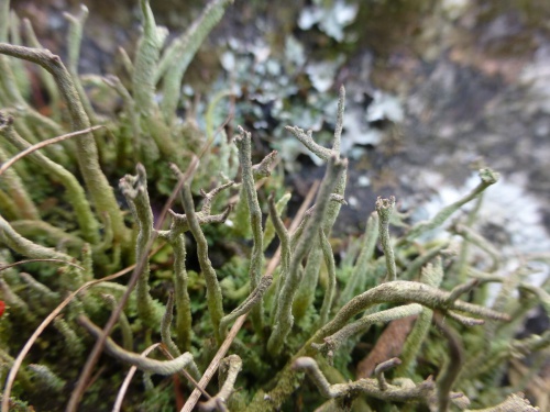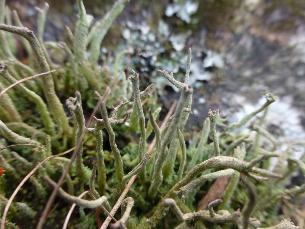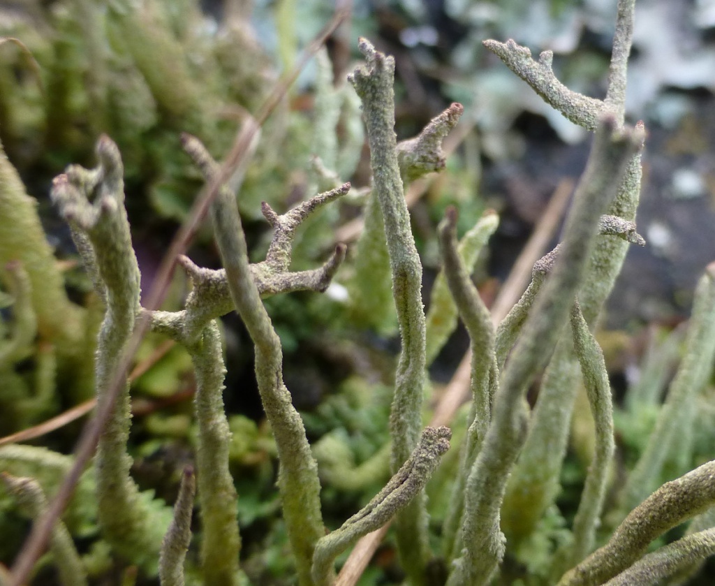 A greyish, slender, commonly unbranched lichen, tapered to a point, usually with a longitudinal fissure that may be hidden by soredia, apothecia brown, rare. Easily confused with similar species if critical features are not checked.