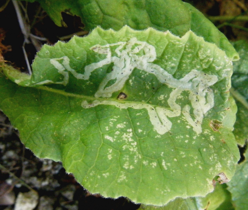 The larva of the Agromyzid fly Chromatomyia primulae mines the leaves of Primrose and Cowslip. The leafmine is white and in long, narrow corridors. Frass usually appears as large, well-spaced grains.