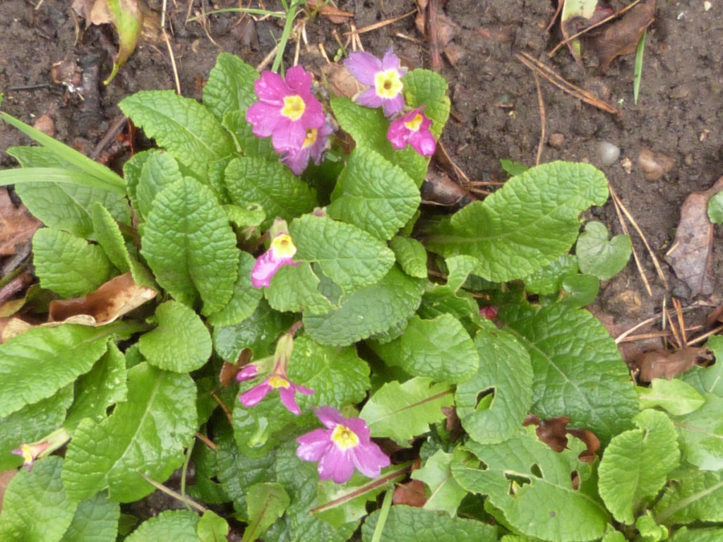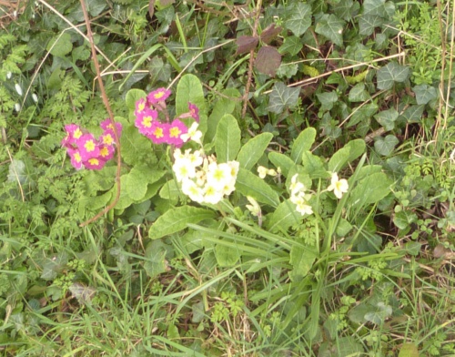 Cultivated Primroses can vary a great deal in colour and size. They are probably hybrids between Primula vulgaris and P juliae (P x pruhonicensis) but other species may also be involved. They often escape into the wild and are frequent in parks, churchyards and roadsides near habitation. Following advice from the local VC55 Botanical Society Group, only the standard pale yellow Primrose should be recorded as Primula vulgaris, all other coloured Primroses (white, pink, grey, blue, orange, red etc.) and those in habitats near cultivation should be recorded as Cultivated Primrose (Primula vulgaris 'Cult.').