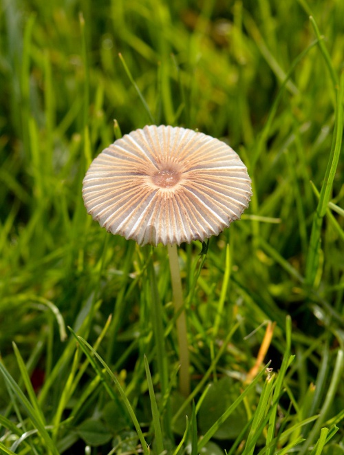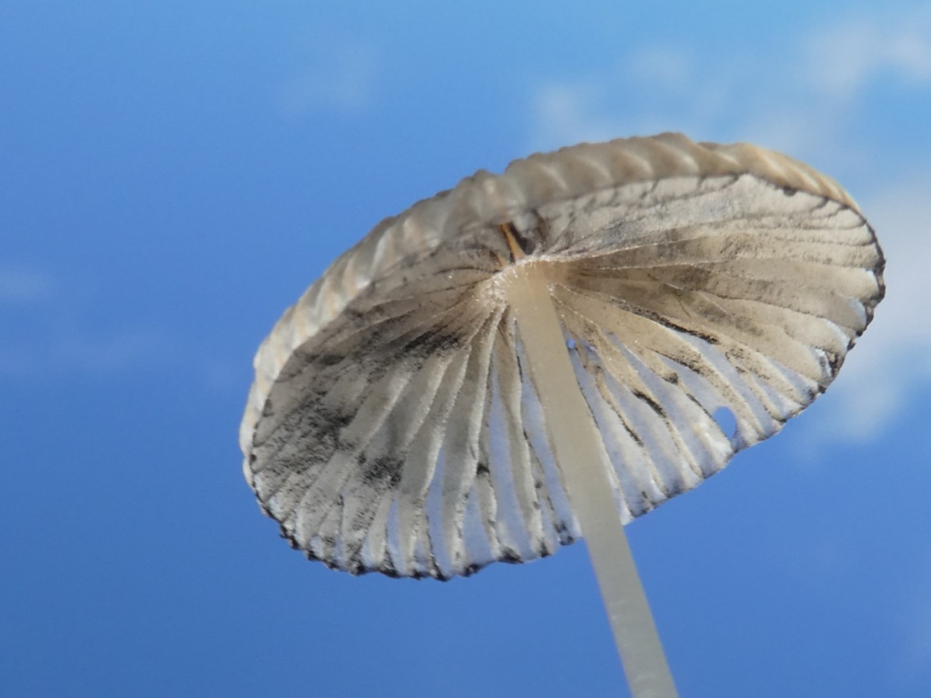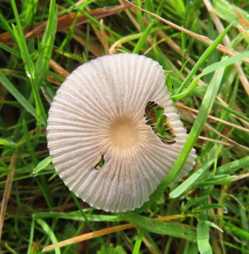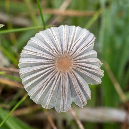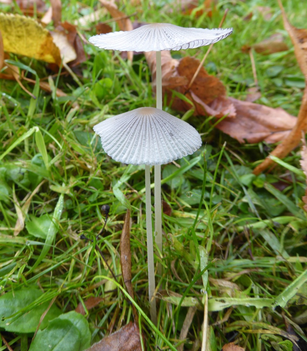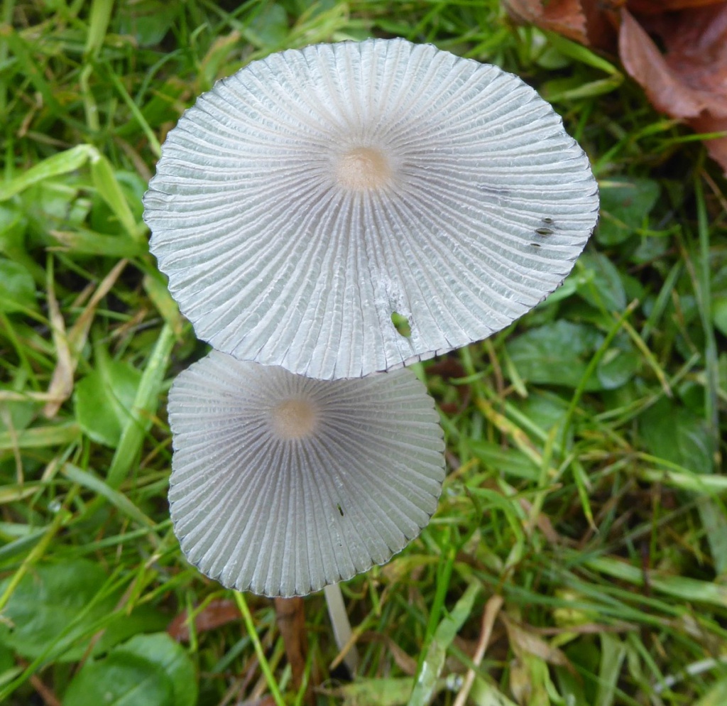 There are several similar species in this genus, and the spores need to be examined under the microscope to identify. They are small and very fragile and ephemeral with a strongly plicate (pleated) and very thin cap. There is some variation in colour, but they are generally brownish when young, becoming pale grey as the cap expands, with a brownish central disc. The gills are very free (i.e. not attached to the stipe) and shrivel rather than deliquesce or turn to ink when over-mature. The spore print is black.