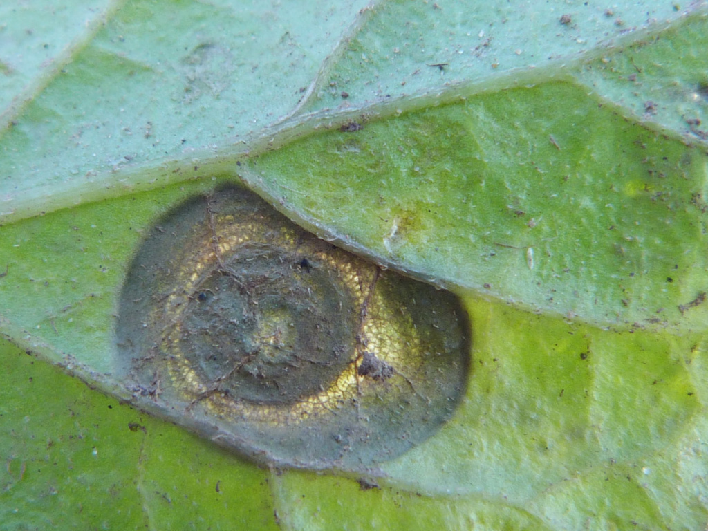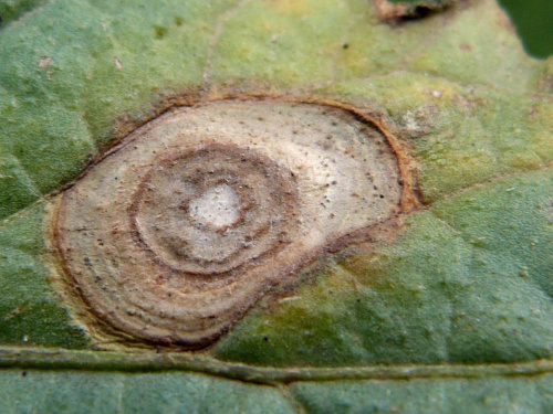 Alternaria solani is a fungal pathogen that infects various members of the Solanaceae family (tomatoes, potatoes, nightshades etc.). It may affect most parts of a plant, but is most likely to be found on the lower leaves, where it produces round or irreguler dark brown spots with characteristic concentric ridges or rings, sometimes likened to a Bull's-eye target.