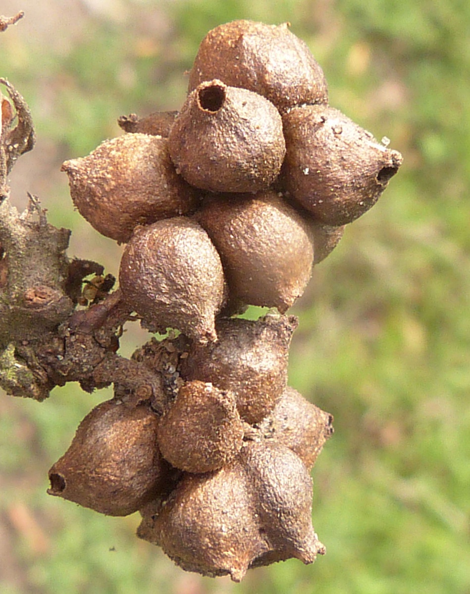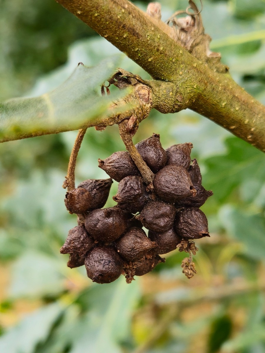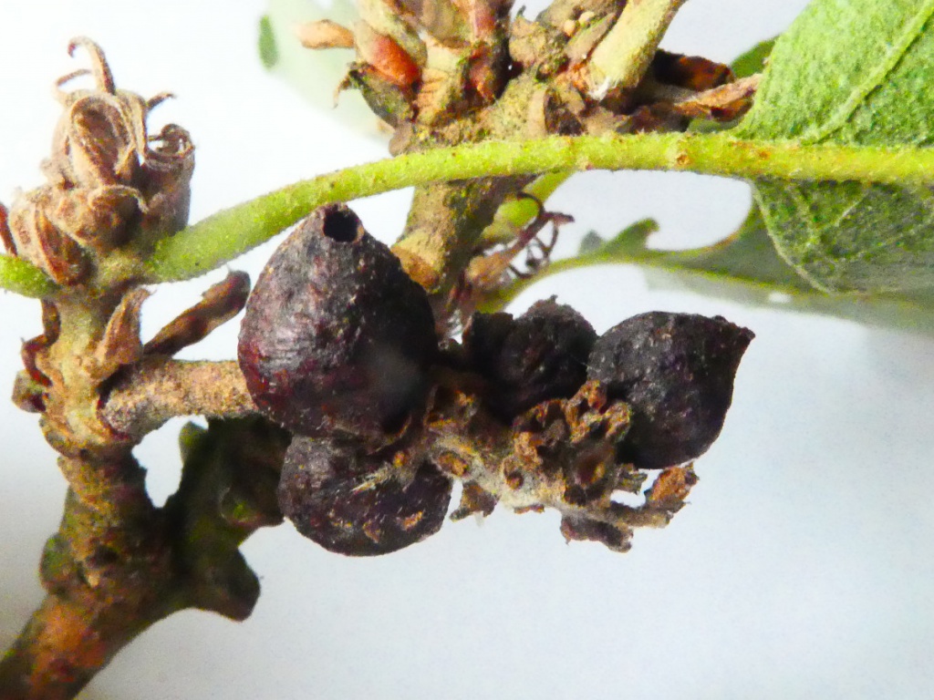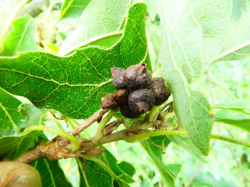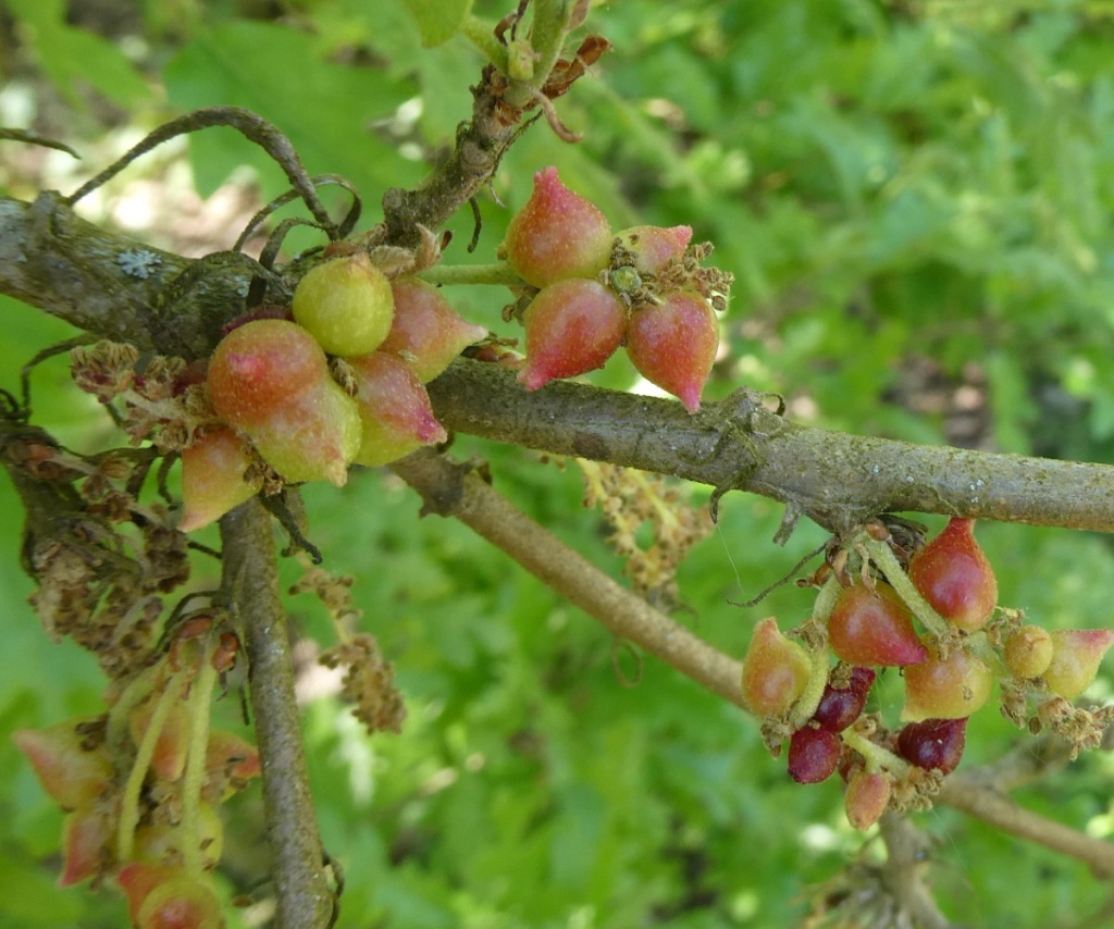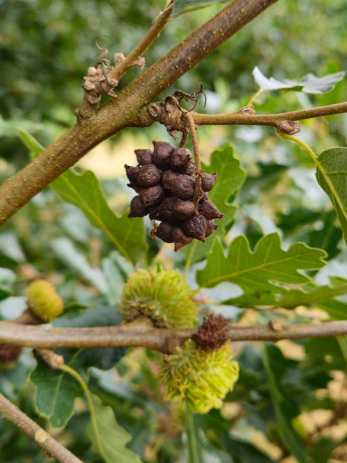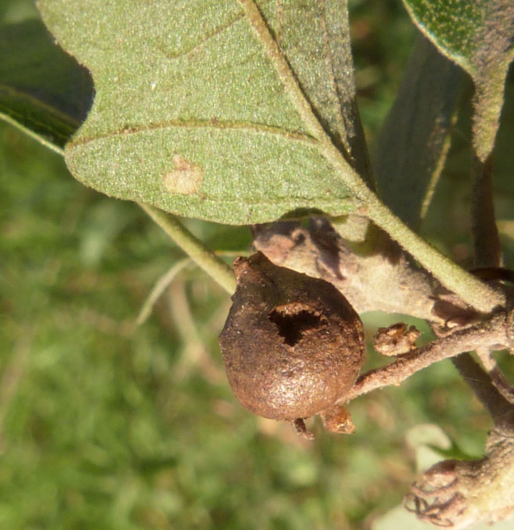 In spring, galls are caused by the sexual generation of wasps on the catkins of Turkey Oak. These galls grow to about 6mm and shaped like pointed peas; green at first, then becoming bright red. The vacated brown galls often persist into autumn.