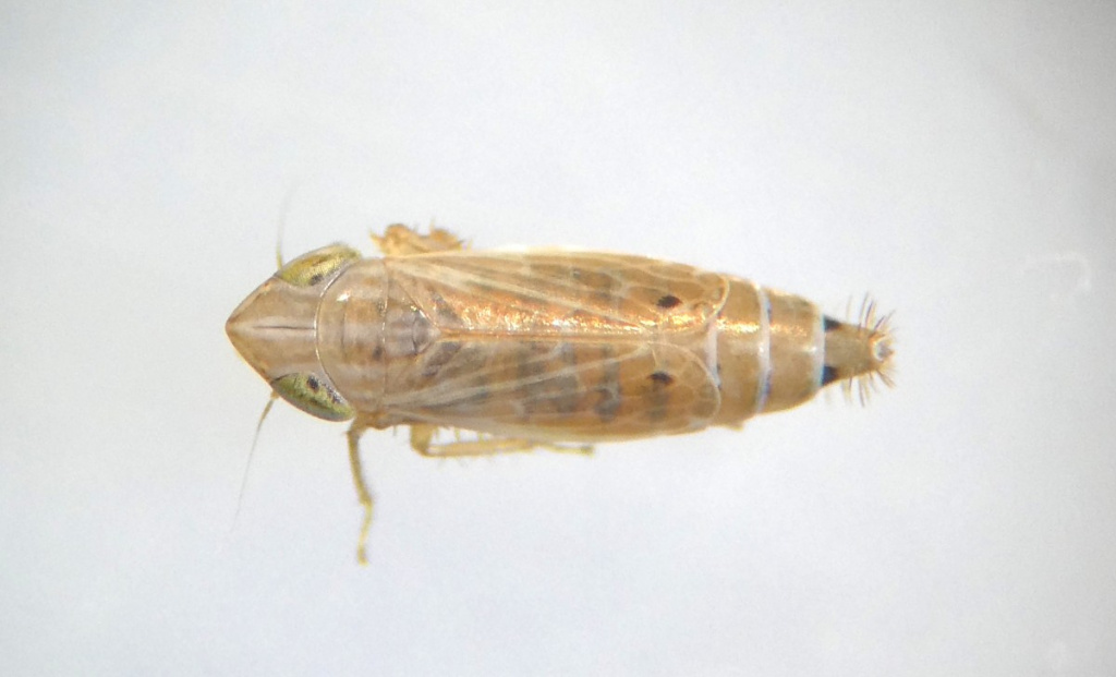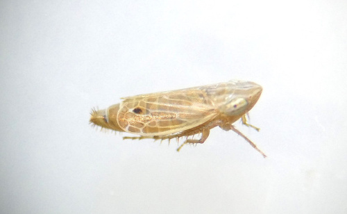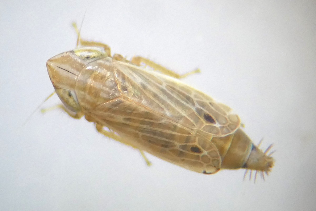 A small brown hopper associated with dry grasslands. It has a dark spot in the sub-apical cell of the forewing, two white/hyaline triangles near the wing apex along costal margin, and a dark streak down the centre of vertex.