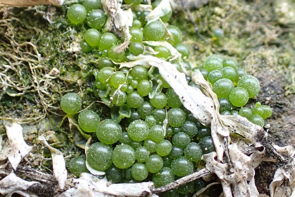 This yellow-green alga forms clusters of minute pinhead-sized bright-green spheres attached to soil or mud by branching root-like filaments. The whole plant is a single cell.