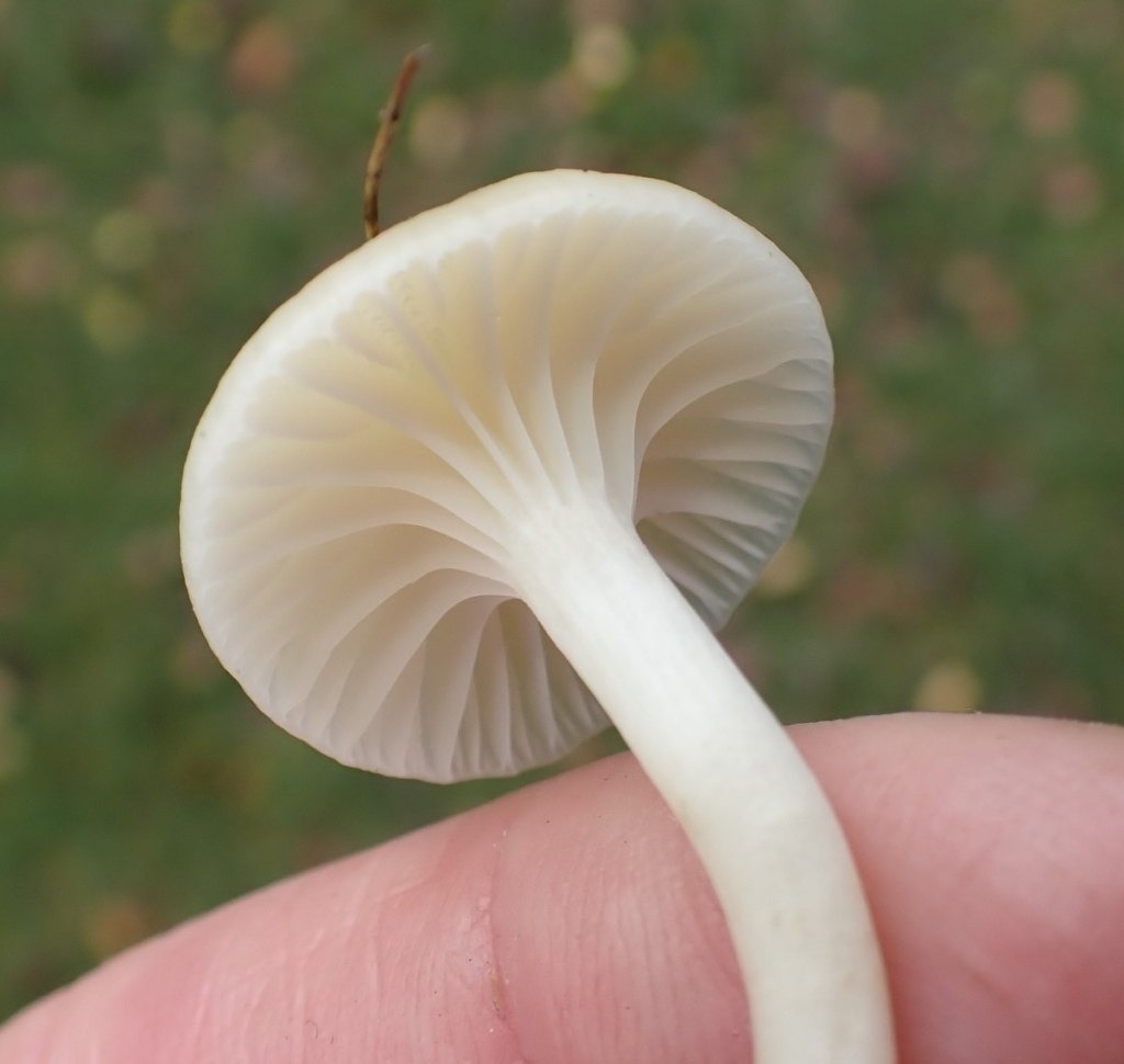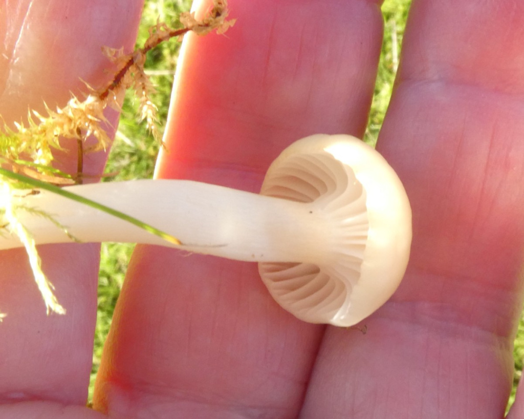 A small ivory, creamy or yellowish-white waxcap, with a slightly greasy cap and decurrent gills. Very similar to snowy waxcap and not possible to identify from appearance or a photo. However it has a strong scent of cedar oil, like some wooden pencils, or Russian leather.
