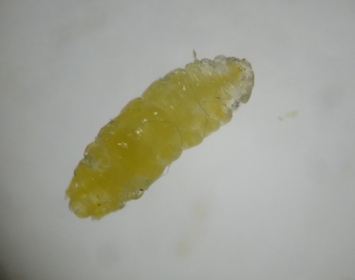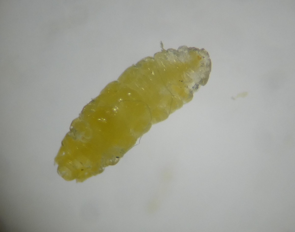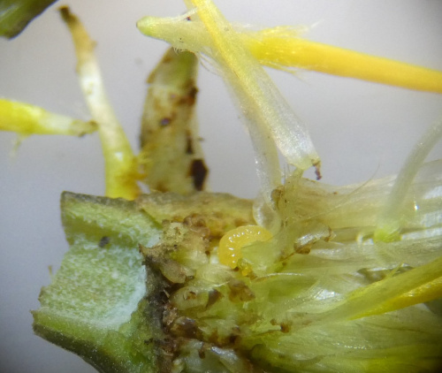 A gall-midge affecting Common Cat's-ear (Hypochaeris radicata) casuing the flowers to be distorted and some florets to be stunted. Small yellow larvae feed inside the receptacle. The larvae can jump, and several may be found inside each flower head. Note that much larger white maggots or pupae of a different species of fly may also be found.
