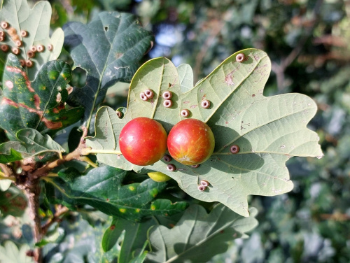 Cynips quercusfolii is a small black gall wasp. Agamic galls are cherry galls on the leaves of some species of oak. The galls are large and succulent, 15 to 25 mm in diameter, smoother on Quercus robur or more warty on Quercus petraea; yellow-green suffused with pink or red, and later dark red then brown with a thick walled chamber. They persist on fallen leaves over winter.