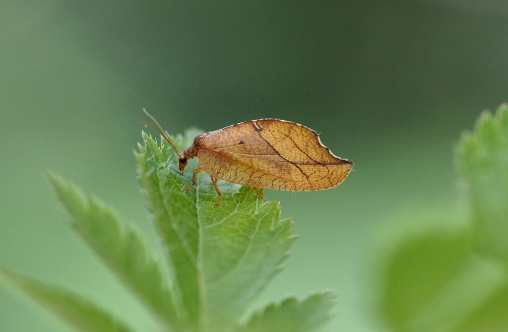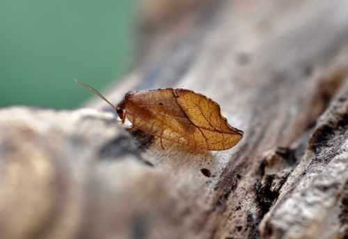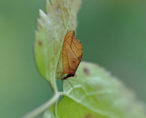 A chestnut-brown lacewing, with broad wings that have dark veins and are hooked at the tip. The resemblance to a dead leaf is remarkable.
