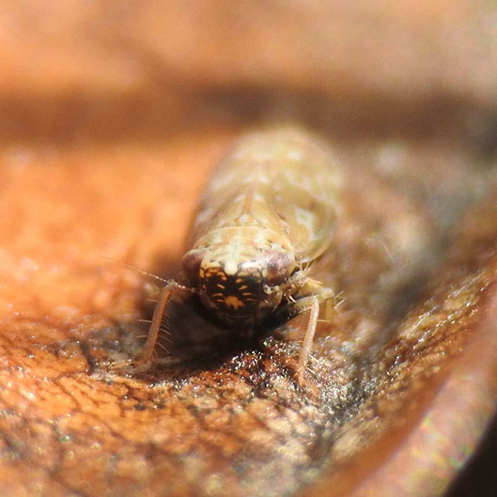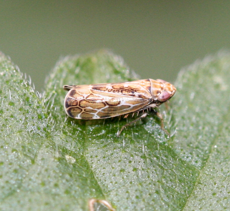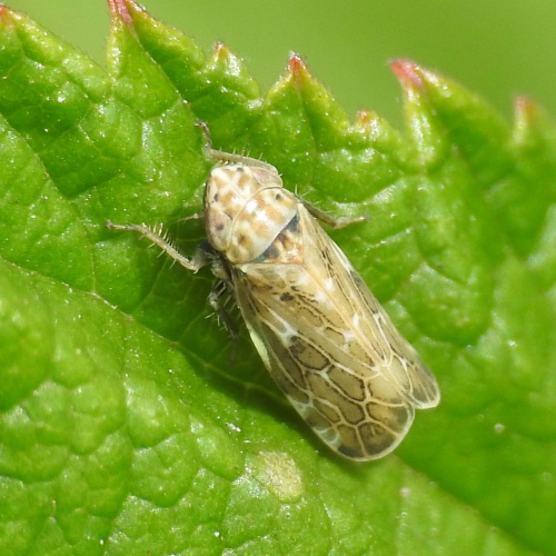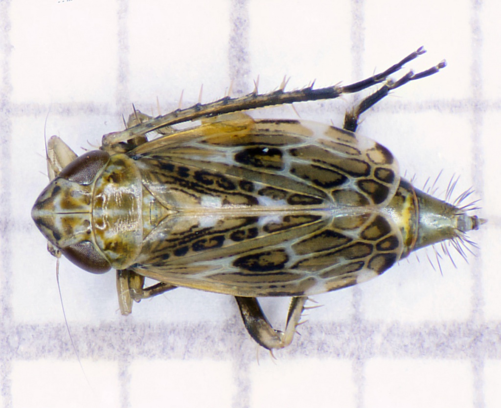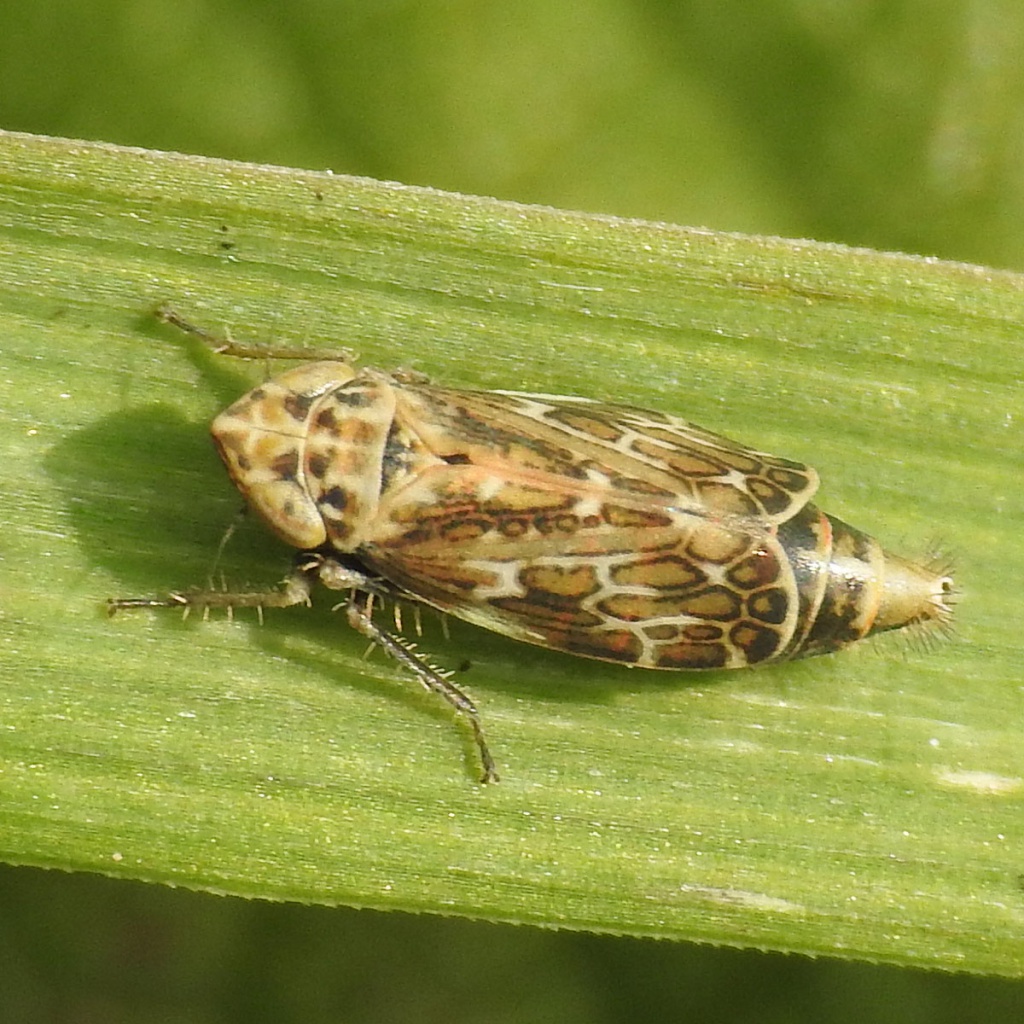 Length 3 to 4 mm. A distinctive species due to the cross-veins in the cells of the clavus (the V-shaped area of the forewing extending behind the pronotum). The cells often have dark edges. The vertex has a pale cross-shaped amrk, and the frons is mainly dark, often with a paler central spot