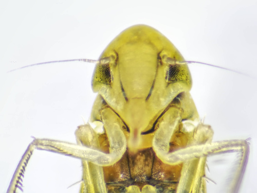 A small leaf-hopper, 3-4mm, associated with ferns. Greenish forewings with a smoky rear part, and yellow pronotum, scutellum and head.