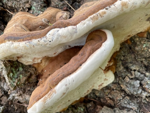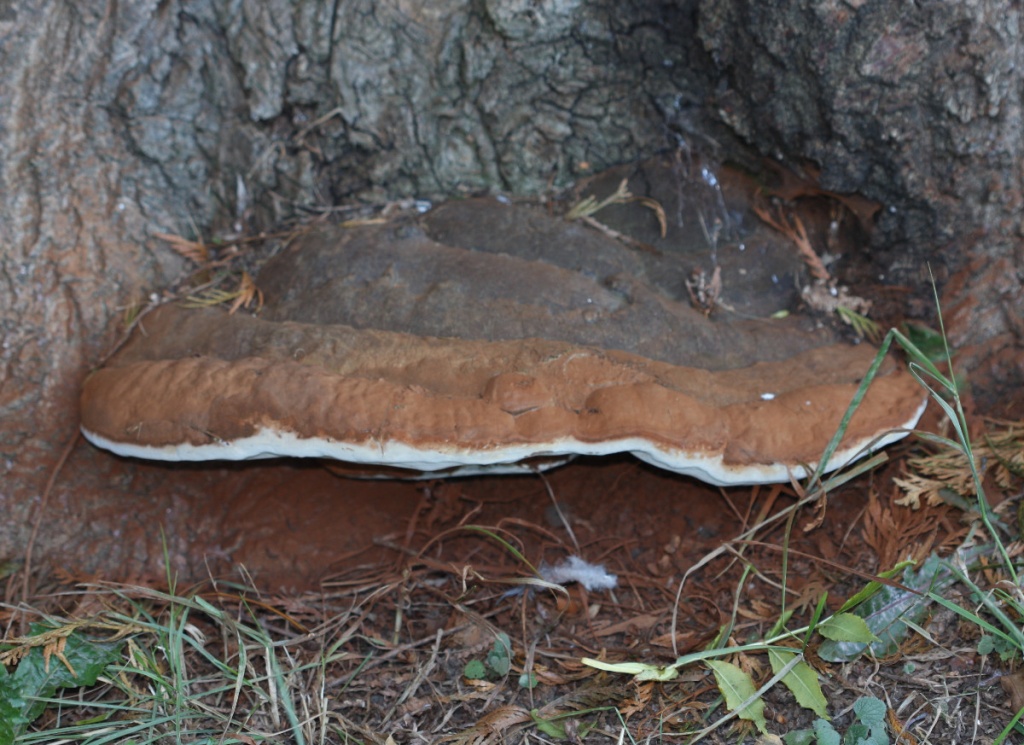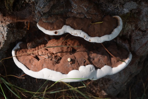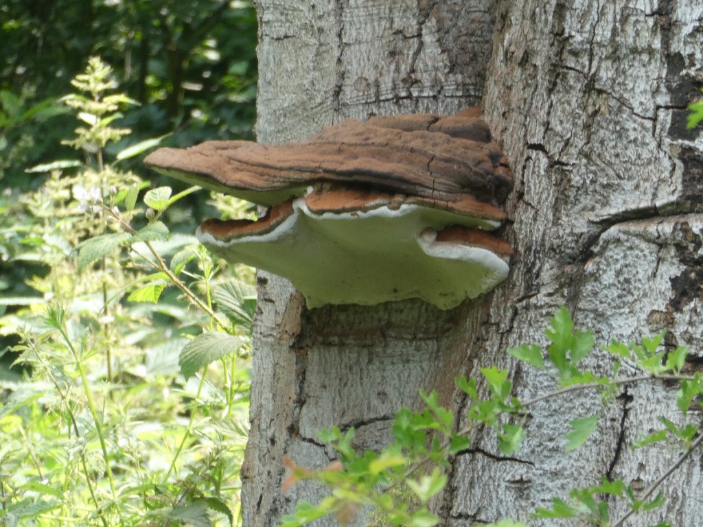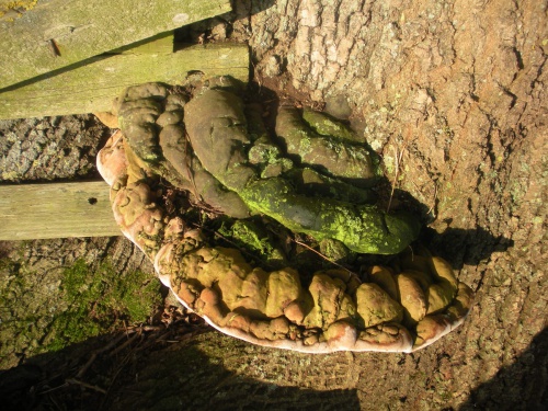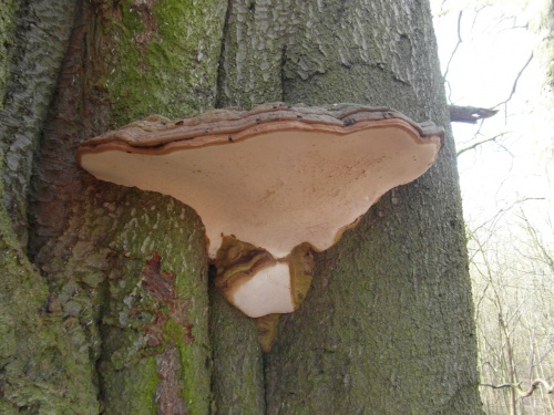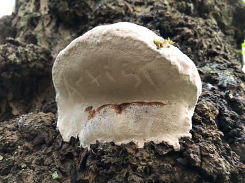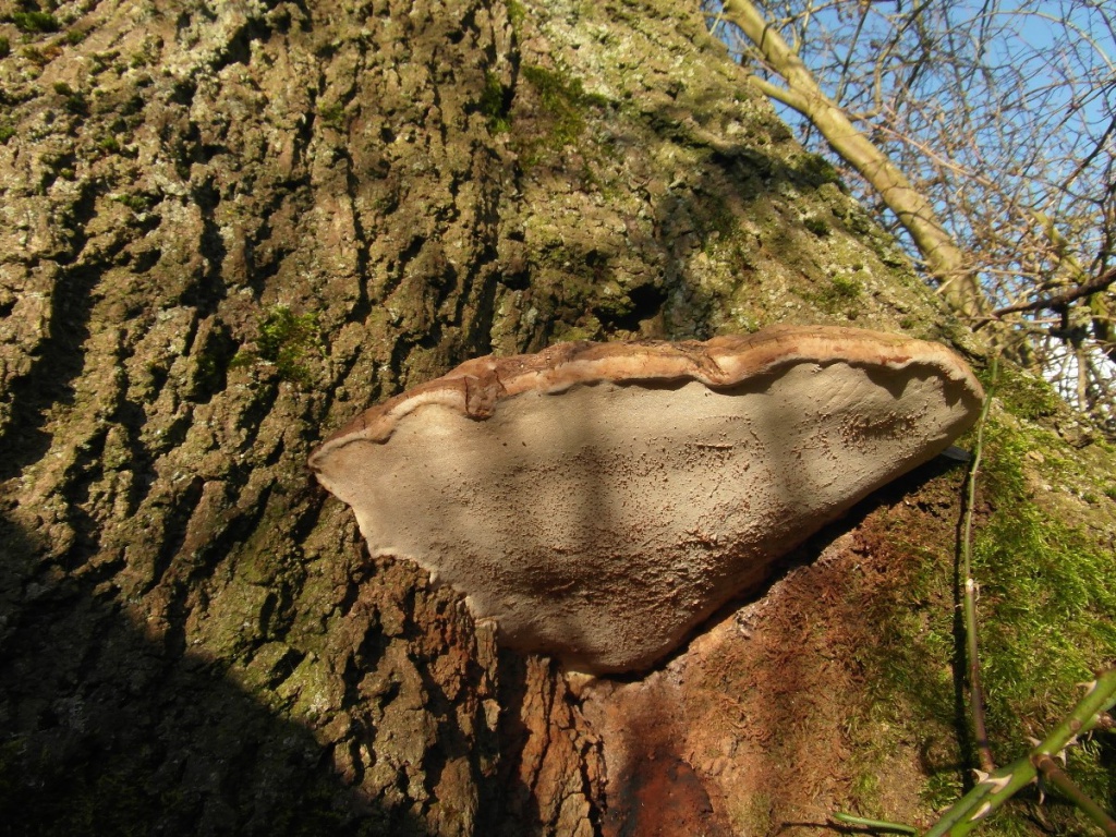 A hard, woody semi-circular bracket fungus, usualy on the trunks of Beech, but sometimes conifers or other decuiduous species. Older specimens have a knobbly upper surface with concentric ridges. The underneath is white or cream with very fine pores, making a smooth surface which can be scratched to create drawings or writings. Spores are brown and abundant, sometimes covering the area below the bracket in fine brown dust.