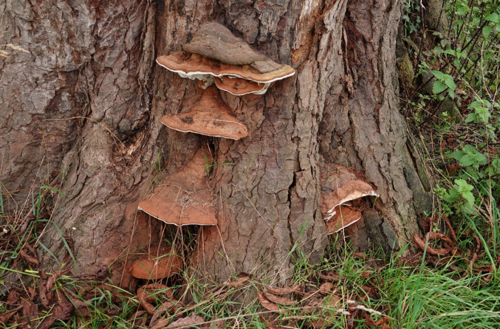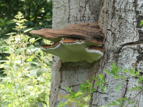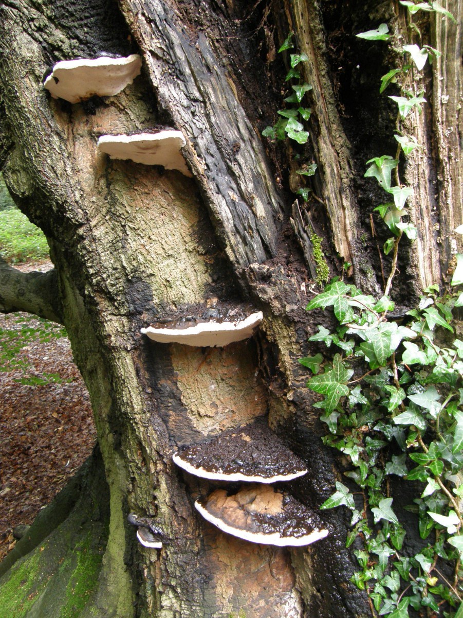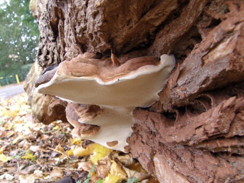 Two very similar species,Ganoderma australe (Southern Bracket) and Ganoderma applanatum (Artist's Bracket), cannot be separated in the field - unless you find the galls of the flat-footed fly, Agathomyia wankowiczii. These are small bobbly outgrowths underneath the brackets, and they are only found on Artist's Bracket, never on Southern.
