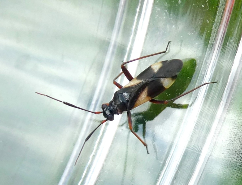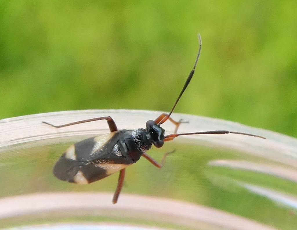 A black and pale yellow mirid bug. Males are usually macropterous with 2nd antennnal segment less than 1.45x the base of the pronotum. Females are usually brachypterous and the 2nd antennal segment is less than 1.75x the base of the pronotum.