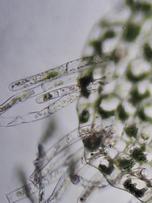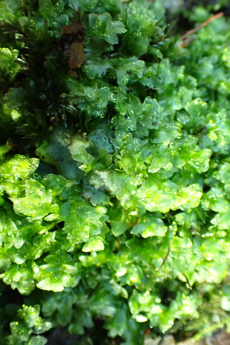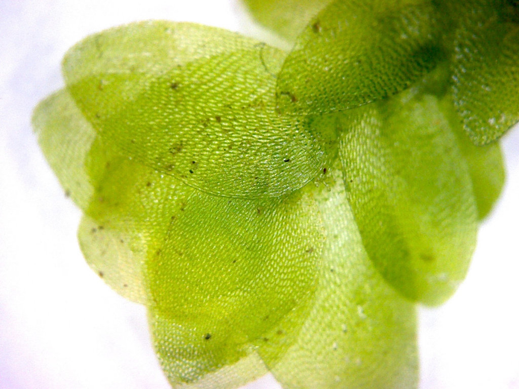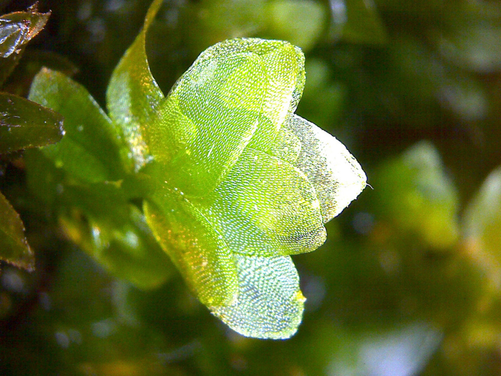 Superficially like a liverwort, but leaves are not in two or three ranks, and the cells are much larger than any UK liverwort