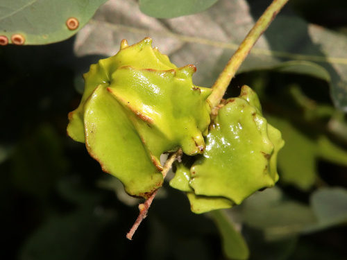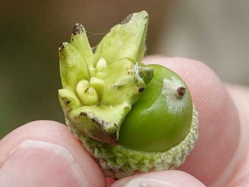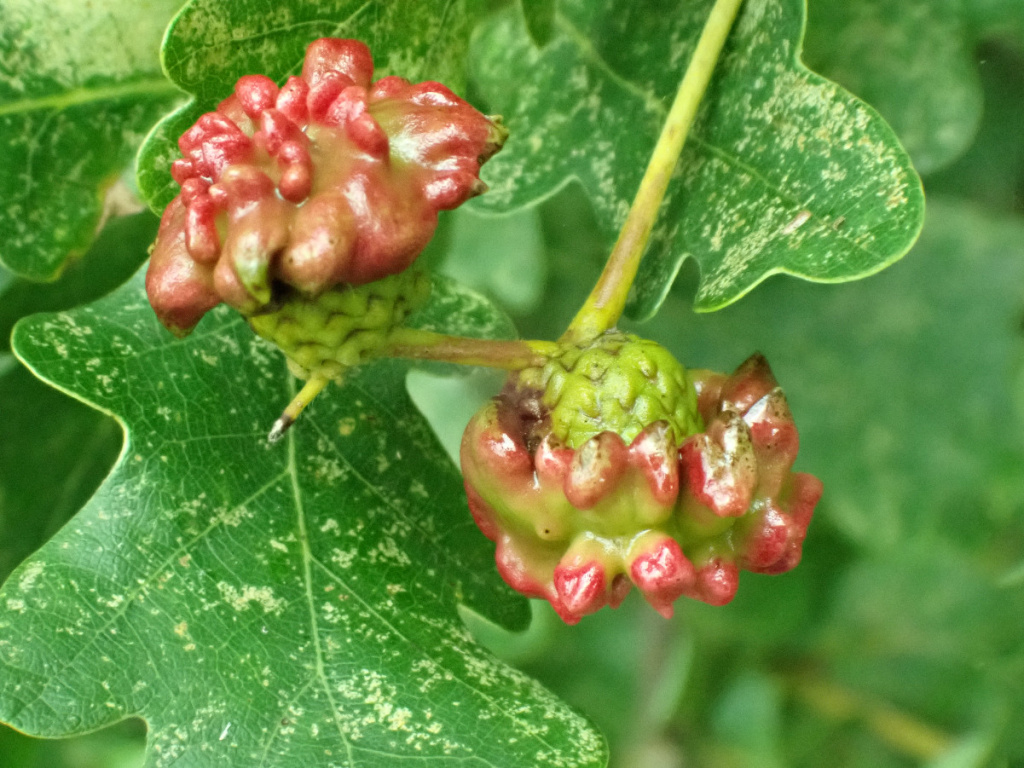 Knopper galls are a mass of ridged tissue formed on acorn cups, with a large central cavity and small inner gall. Multiple galls can form on one acorn. They are green and sticky at first, then reddish and becoming brown and woody. Eventually they fall and can be found carpeting the ground under oaks.