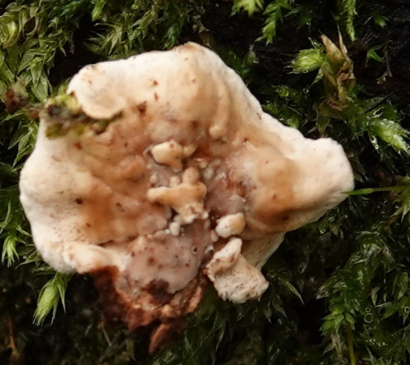 A resupinate fungus that sometimes forms brackets. The upper surface is brown and felty and the underside smooth and whitish, becoming darker as it ages. It has a white margin. The spores are small and warty.