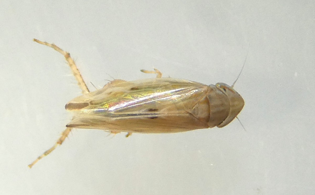 A small deltocephaline leafhopper with rather pointed wing apices. Whilst many specimens lack dark markings on the clavus, some may have a dark spot. There are other dark markings on the forewings.