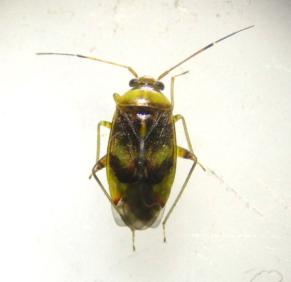 A small bug associated with Mistletoe. The pronotum is a yellowish-green and the forewings dark with a pale blotch; the green cuneus has a red tip.