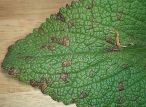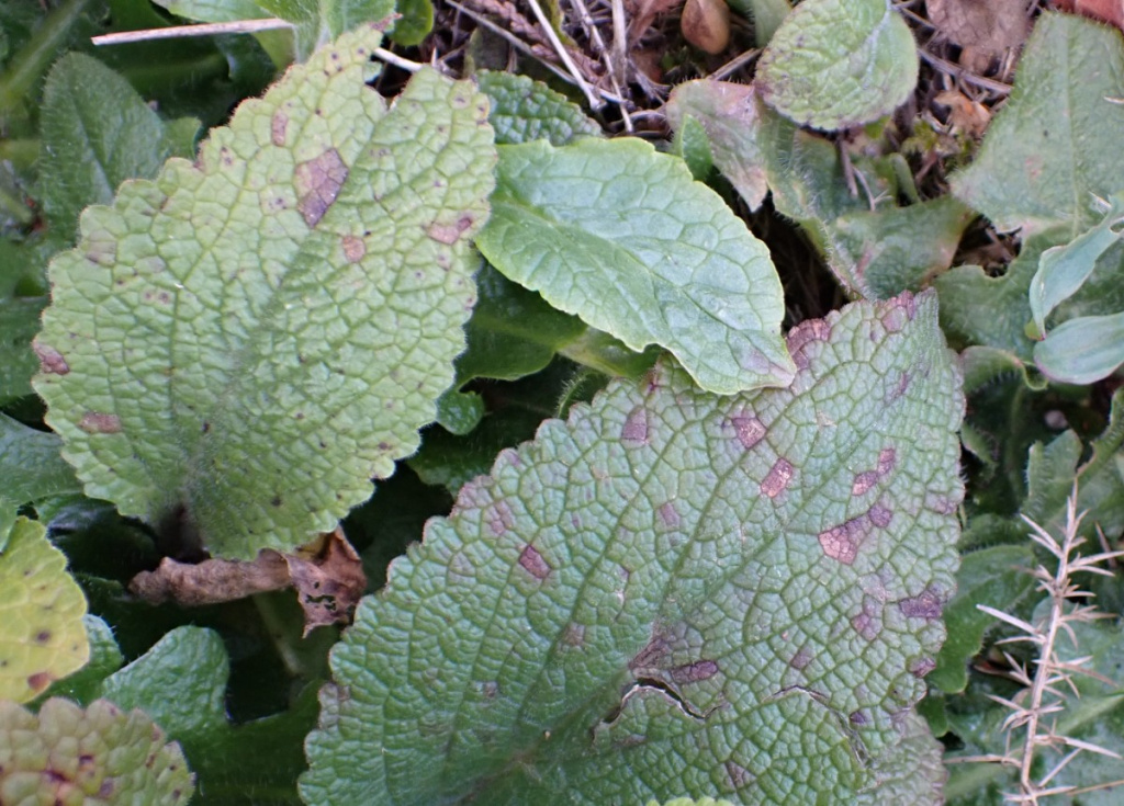 A white mould that affects Foxglove and Mulleins, causing brown leaf spots. White tufts of conidia (caespituli) are mainly on the leaf undersides. The conidia are long and narrow and formed in chains
