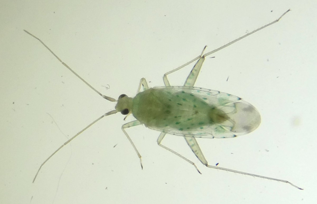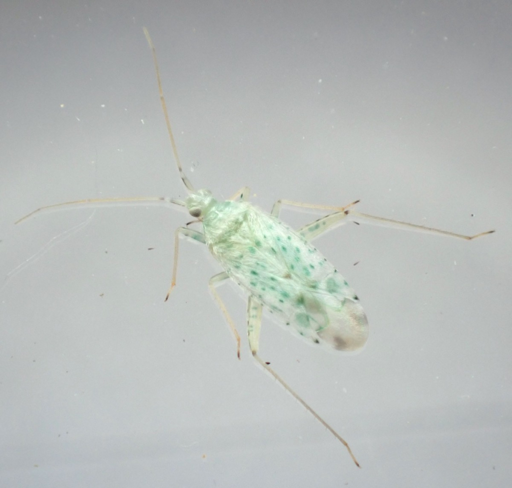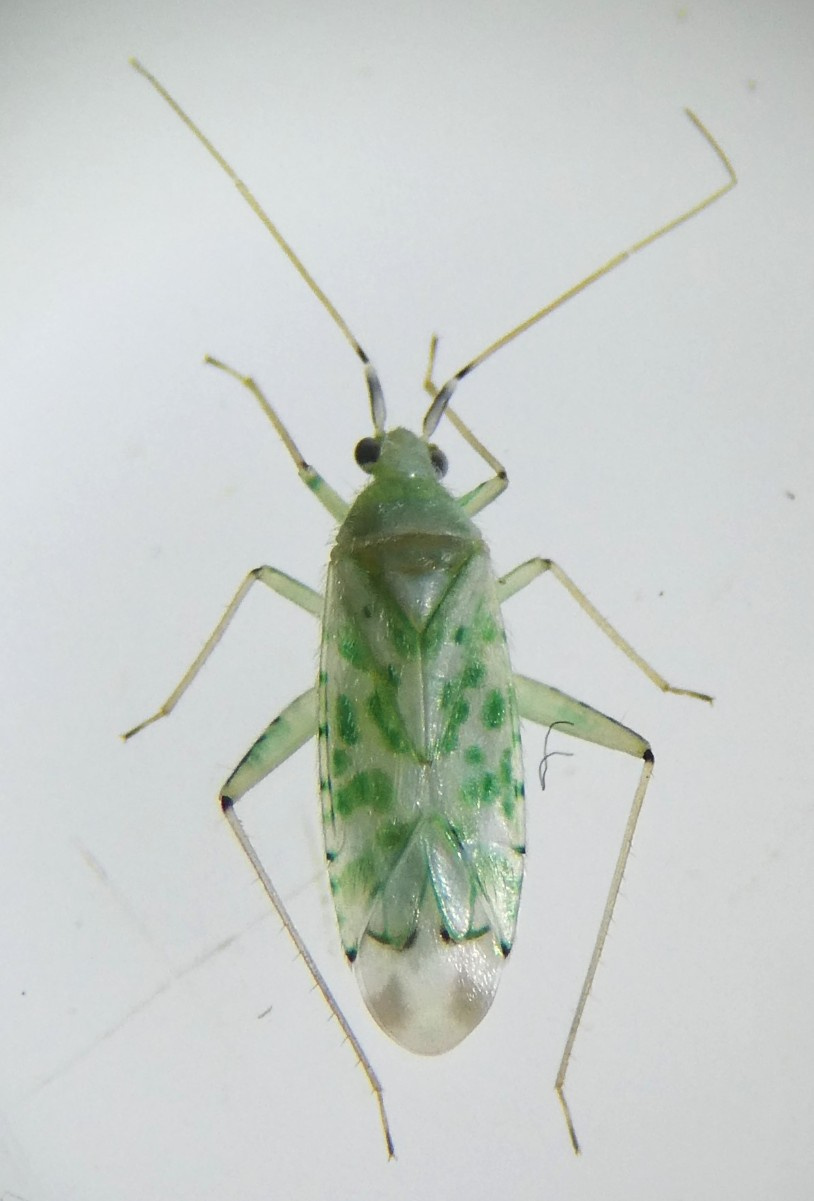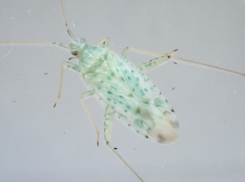 Malacocoris chlorizans has a similar mottled green dorsal surface, but is apple green not blue green.