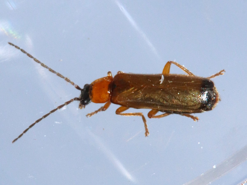 A larger Soldier Beetle (8-10 mm) with black head, red scutellum and red elytra with a black tip. As with all Rhagonycha, the 3rd segment of the mid and hind tarsi is not lobed, unlike Cantharis species.