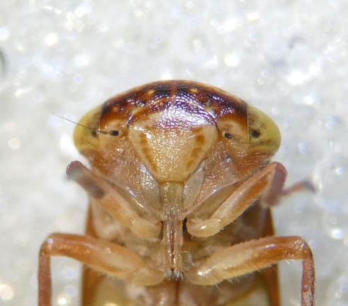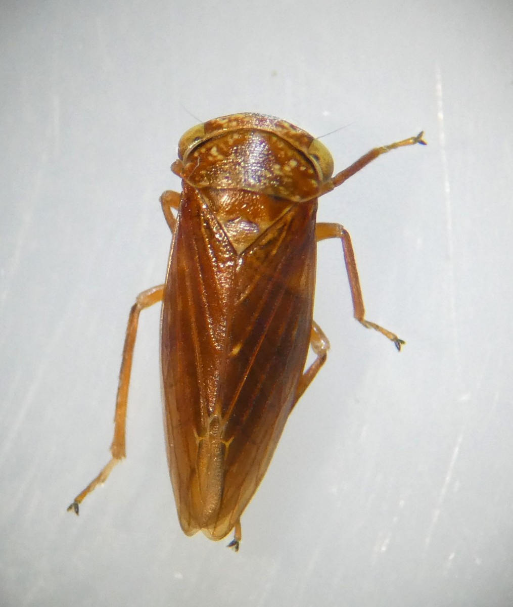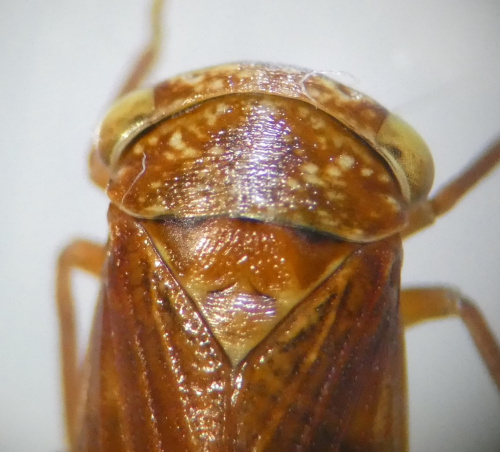 A large (6-7mm) leafhopper associated with Black Poplar and is hybrids. The overall colour is reddish-brown, with fairly plain wings. The vertex and pronotum have fine transverse wrinkles and the forewings are along wrinkled along the veins - these features are unique to this species in this subfamily.