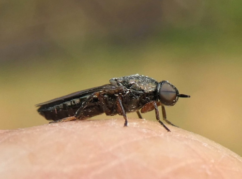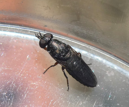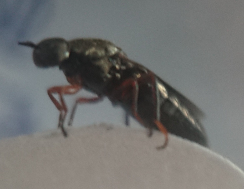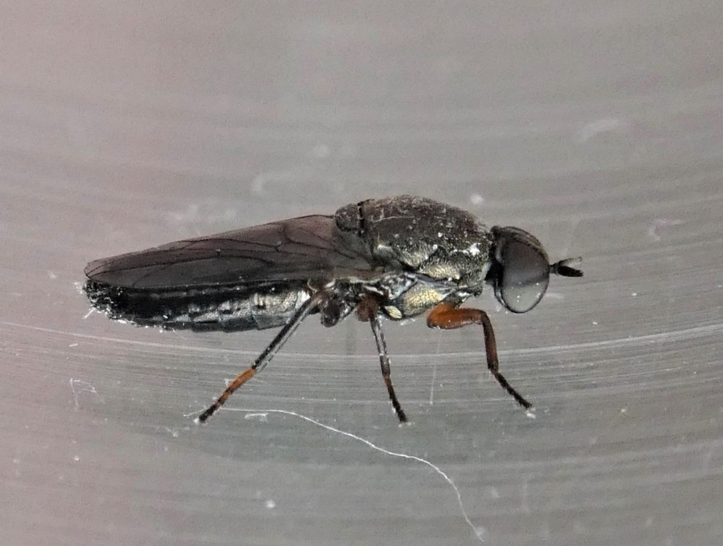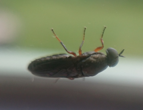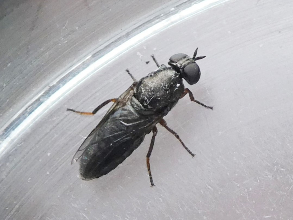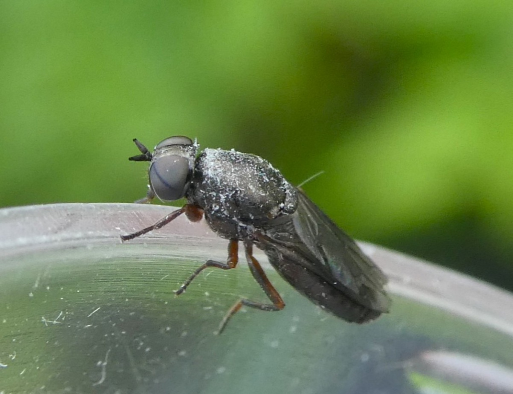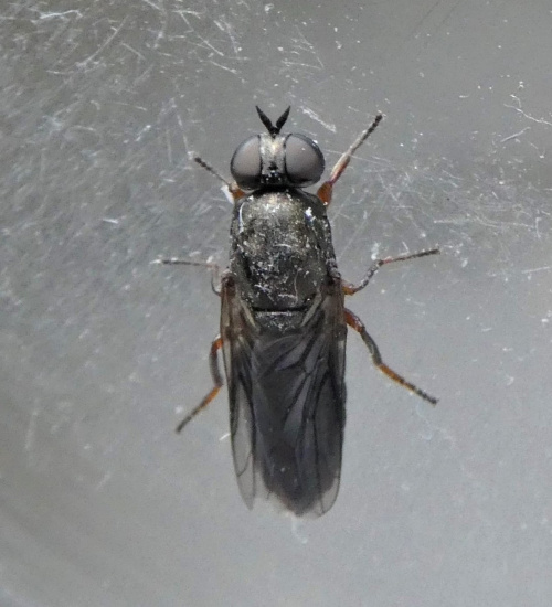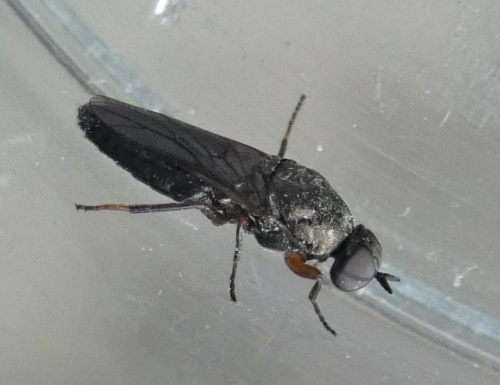 A small, black fly with dull orange legs. The head has a semicircular outline with large eyes.