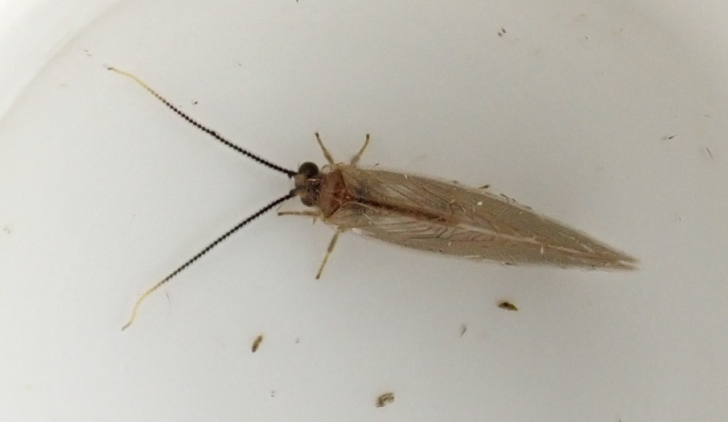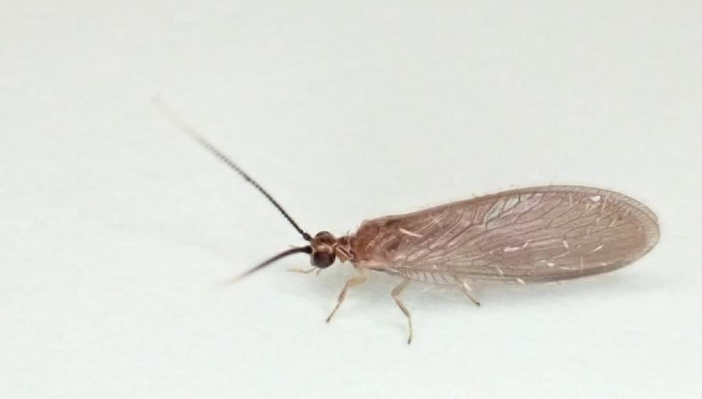 A small pale-brown lacewing, with typical Sisyridae wing venation of three longitudinal veins in the forewing. The antennae are dark at the base and light at the tip.